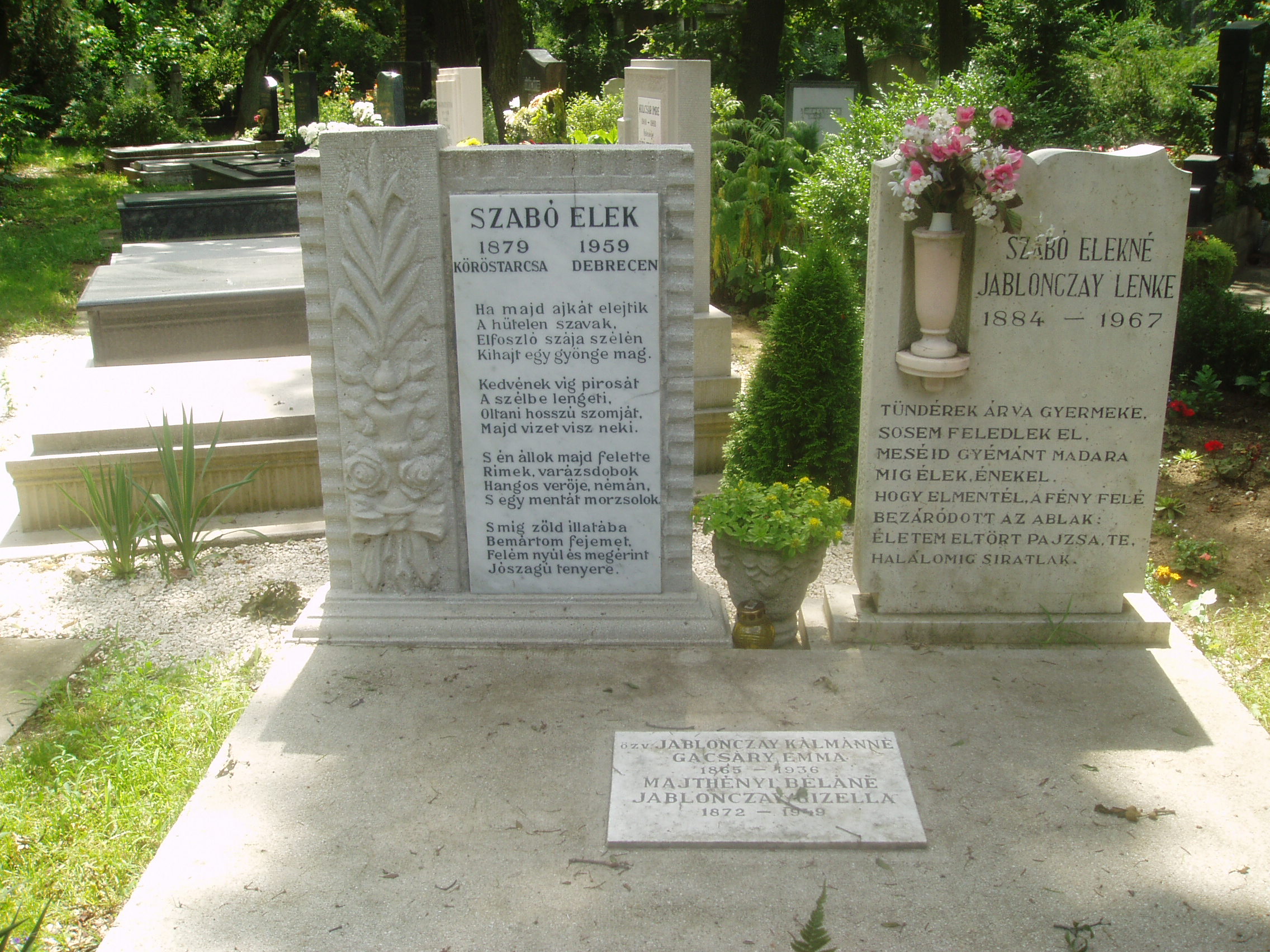 Nyilvános 1232 | 3977 | Rövid leírás | Teljes leírás (1.1 KB) | Debrecen, Bocskai út, Köztemető: Szabó Elek, Jablonczay Lenke és Szabó Magda sírja Debrecen új köztemetőjét 1932-36 között alakították ki. A temetőkertet és a nagy művészettörténeti értéket képviselő ravatalozó épületét Borsos József tervezte. Ebben a temetőben nyugszanak Szabó Elek és Jablonczay Lenke, Szabó Magda Kossuth-díjas író szülei. Ők egyúttal az írónő több dokumentum-regényének, illetve regényének hősei is (Ókút, Régimódi történet, Für Elise). A sírkő tanúsága szerint ugyanebben a sírban nyugszik Gacsáry Emma, Jablonczay Lenke édesanyja és Jablonczay Gizella, Jablonczay Lenke nagynénje. Ők ugyancsak ismerősek Szabó Magda említett könyveiből. 2007. december 1-je óta Szabó Magda, Debrecen díszpolgára hamvai is itt nyugszanak. Az írónő november 19-én, életének 91. évében hunyt el. Végakaratának megfelelően hamvai egy részét a budapesti Farkasréti temetőben férje, Szobotka Tibor sírjában helyezték nyugalomra. A fénykép 2006 júniusában készült. |