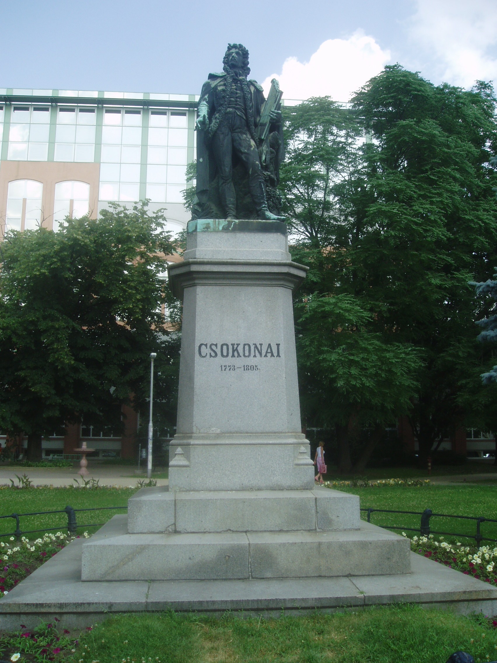 Nyilvános 983 | 1852 | Debrecen, Kálvin tér: Csokonai Vitéz Mihály szobra | A Kálvin tér ékessége Izsó Miklós Csokonai Vitéz Mihályt ábrázoló, 1867-ben készült romantikus szobra. A magas márvány talapzaton álló és arccal a Kollégium felé tekintő szobor szakértői vélemények szerint az egyik legszebb köztéri szobor Magyarországon. A szobor magyaros ruhában, zsinóros mentében, lanttal a kezében, szőlőtőke mellett jeleníti meg az anakreoni dalok költőjét, mintegy az ihlet pillanatában. A művész eredetileg vékonyabb testalkatúnak mintázta Csokonait (ez a gipszvázlat a Kollégiumban található), de a terv nem nyerte el a debreceni cívisek tetszését, mondván, hogy ilyen sovány ember nem élhetett Debrecenben... A fénykép 2006 júniusában készült. Felh. irod.: Papp Antal: Debrecen. Bp. Panoráma, 1976 Kovács Gergelyné: Debrecen. Bp. Panoráma, 1981 |