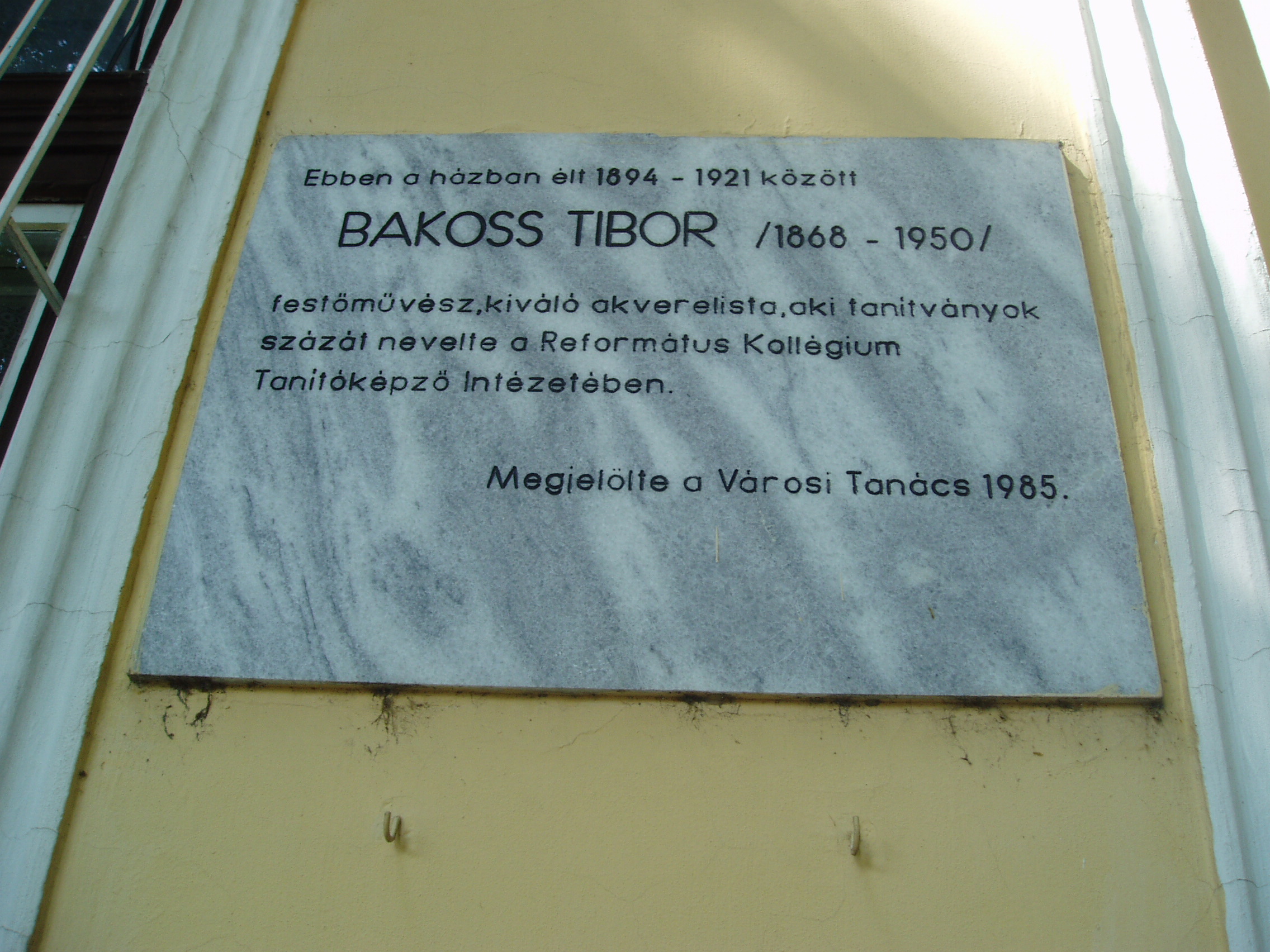 Nyilvános 933 | 1575 | Debrecen, Darabos utca 42. | Ebben a házban élt 1894 és 1921 között Bakoss Tibor (1868-1950) festőművész, a debreceni Református Kollégium Tanítóképző Intézetének tanára. A nagykőrösi születésű művész 1886-91 közötta Mintarajziskolában Székely Bertalan és Madarász Viktor tanítványa volt, majd Sümegen lett rajztanár. 1890-től 1894-ig szülővárosában tanított, majd 1894-től 1921-ig a Debreceni Református Kollégiumban rajztanárként dolgozott. A Debreceni Műpártoló Egyesület egyik alapító tagja és vezéregyénisége volt. Az 1910-es években számtalan kisgrafikát készített, de kedvenc műfaja az akvarell volt. A fénykép 2006 júniusában készült. Felh. irod.: Magyar életrajzi lexikon Szabó Ákos - Kállai Tibor: Magyar festők és grafikusok életrajzi lexikona. Nyíregyháza, 1997 |