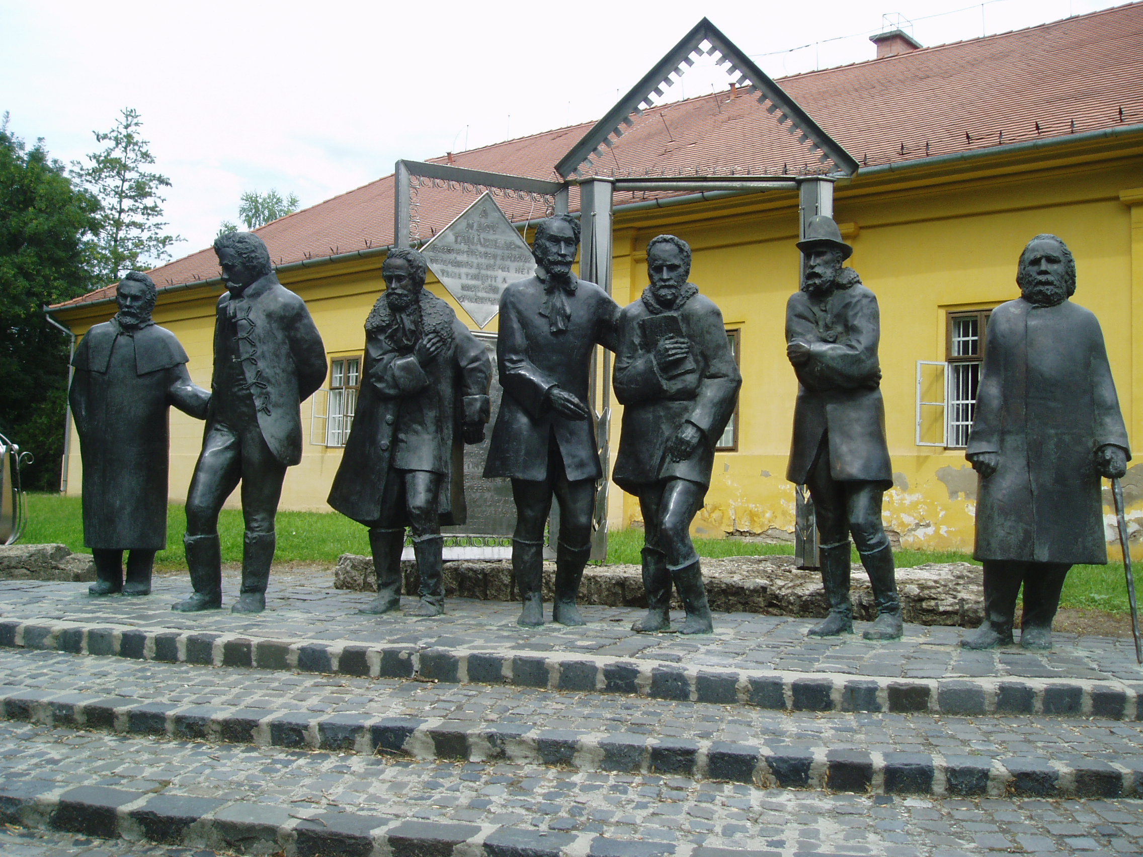Nyilvános 1284 | 3171 | Rövid leírás | Teljes leírás (1.79 KB) | Nagykőrös, Ceglédi út 19. Arany János Múzeum. Varga Imre: Nagy tanári kar - szoborcsoport Varga Imre: Nagy tanári kar című szoborcsoportját 1996. augusztus 20-án leplezték le az Arany János Múzeum épülete előtt. A szoborkompozíció a magyar kultúra azon kiemelkedő egyéniségeit örökíti meg, akik a Bach-korszakban a nagykőrösi gimnáziumban tanítottak, Nagykőrösön működtek. A legismertebb egyéniség, a nemzet halhatatlan költője, Arany János 1851-1860 között élt és alkotott Nagykőrösön. Mint ő írta egy levelében: a fél Akadémia Kőrösön van... A város történetének kiemelkedő egyéniségei továbbá Salamon Ferenc, Szilágyi Sándor történészek, Szabó Károly bibliográfus, Szász Károly költő, műfordító, református püspök, Szigethi Warga János neveléstörténész, Tomory Anasztáz matematikus és mecénás. A "Nagy tanári kar" működése Nagykőrös mezővárosi fejlődésének fénykorát reprezentálja. Ebben az időszakban Nagykőrös a magyar kultúra meghatározó központja volt, "magyar Weimar"-ként emlegették a várost, Arany Jánost pedig Goethe-hez hasonlították. Mindennek természetesen a politikai helyzet volt az oka: a szabadságharc utáni megtorlás időszakát átvészelt meghatározó értelmiségiek részben kiszorultak a Bach-korszak fővárosából, részben önként jöttek, mert egy kisvárosban szabadabban munkálkodhattak, s nagyon távolra mégsem kerültek Pesttől. A fénykép 2006 augusztusában készült. Felh. irod.: www.c3.hu/~pmiajm/hunnagyk.htm www.vendegvaro.hu Törös László: A nagykőrösi Arany emlékek katalógusa. = A nagykőrösi művelődés hármas kis tüköre. Nagykőrös, 1935 |