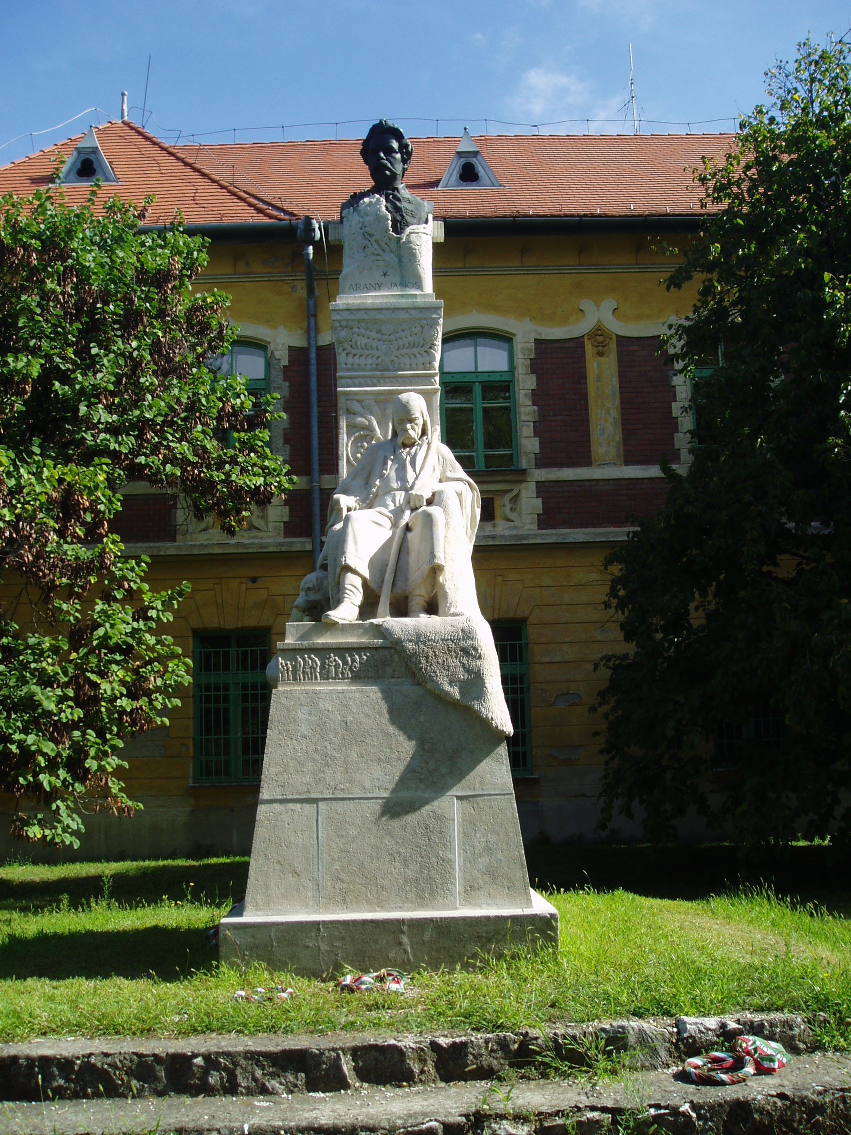 Nyilvános 1162 | 2749 | Nagykőrös, Szabadság tér: Arany János mellszobra | Arany János 1851 és 1860 között Nagykőrösön élt és a helyi gimnázium magyar-latin tanára volt. Költői pályájának kiteljesedését hozták ezek az évek. Tudós történész tanártársainak is szerepe volt abban, hogy érdeklődése a magyar múlt felé kanyarodott, s megszülettek halhatatlan balladái (például a Zács Klára,a Szondi két apródja, a Hunyadi-balladák, A walesi bárdok). Összesen több, mint száz, kisebb-nagyobb verses elbeszélő költeményt, balladát, verset írt a városban, s közben tanárként is rendkívül lelkiismeretes munkát végzett (dolgozatjavításai, a diákok számára készített jegyzetei ma a múzeumban láthatók - lásd: Nagykőrös, Ceglédi út 19.). Régi iskolája s egykori lakóháza (lásd: Nagykőrös, Hősök tere 4.) előtt, a Református templom kertjében 1910-ben leplezték le Strobl Alajos által készített emlékművét, amely a költőt fiatal korában ábrázolja. A mellszobor talapzatán Marci bácsi, az Arany által megénekelt vén gulyás ül, kezében hosszú pásztorbottal. A terméskő talapzat felső részét frízként a Marci bácsi temetését ábrázoló jelenet fonja körül. A fénykép 2006 augusztusában készült. Felh. irod.: Tőrös László: A nagykőrösi Arany emlékek katalógusa. = A nagykőrösi művelődés hármas kis tüköre. Nagykőrös, 1935. |