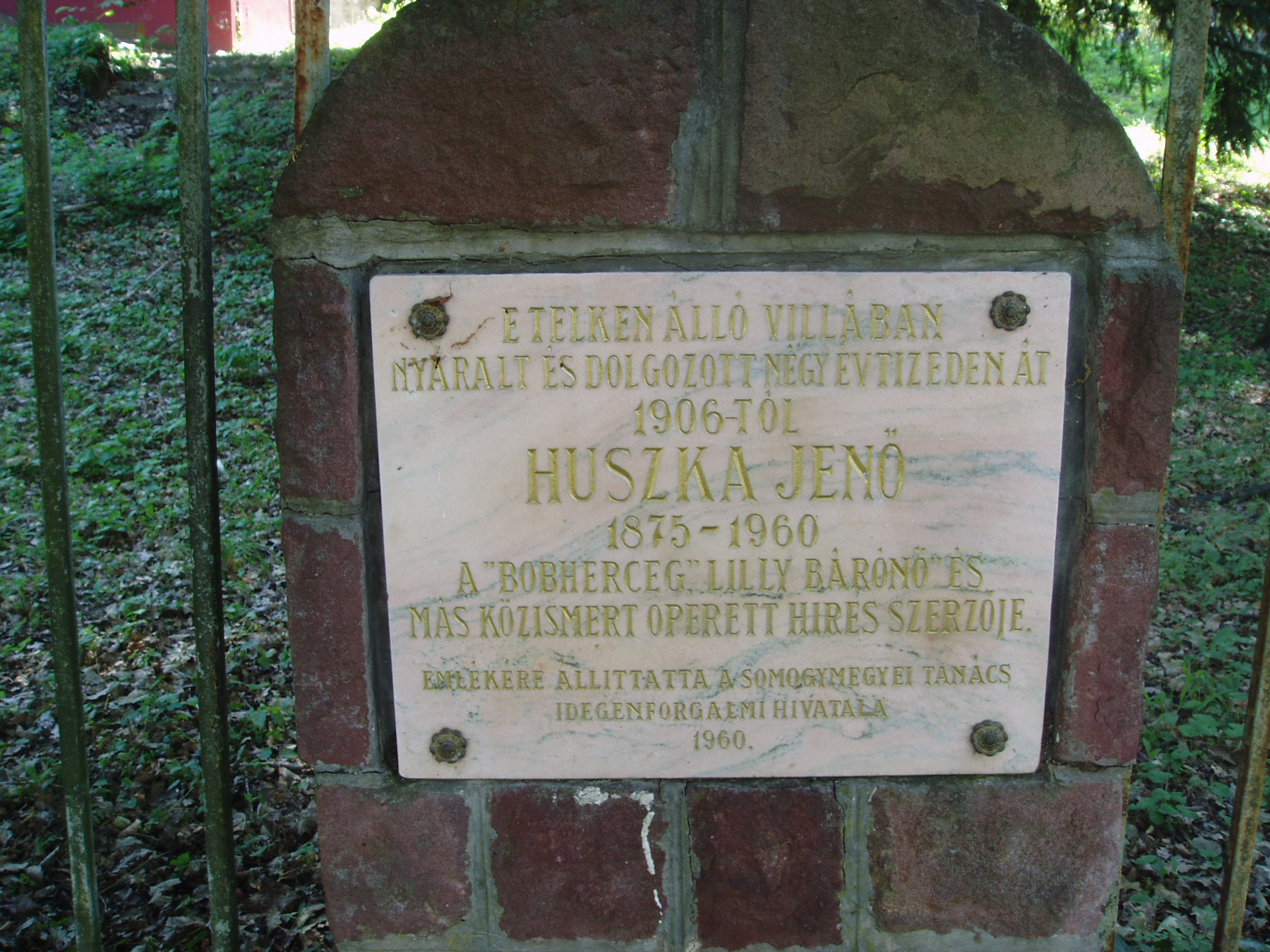 Nyilvános 840 | 1515 | Fonyód, Bartók utca 42. Huszka Jenő villája | A fonyódi magasparton húzódó villasor közepén találjuk Huszka Jenő egykori villáját, ahol csaknem négy évtizeden keresztül, 1907 és 1944 között pihent és alkotott. Huszka először az ettől a villától balra lévő ún. Náray–Szabó–villát vásárolta meg, majd 1906-ban elvette feleségül a mostani Huszka–villa akkori tulajdonosának, Lippich Eleknek a lányát, Leonát. Amikor a házaspár 1924-ben elvált, a zeneszerző megvásárolta a villát, így továbbra is itt töltötte a nyarakat második feleségével, Arányi Mária írónővel. Huszka ebben a villában írta a Lili bárónő több dalát, s itt komponálta a Mária főhadnagy csaknem teljes zenei anyagát. A villában használt íróasztala ma a közeli múzeum állandó kiállításán megtekinthető (lásd: Fonyód, Bartók u. 3.) Sajnos, a villa kerítésén 1960-ban elhelyezett emléktábla szövege meglehetősen pontatlan. A fénykép 2007 júliusában készült. Felh. irod.: Arányi Mária: Szellő szárnyán... Huszka Jenő életének regénye. Bp. Zeneműkiadó, 1977 htp://konyvtar.fonyod.hu/fek.htm |