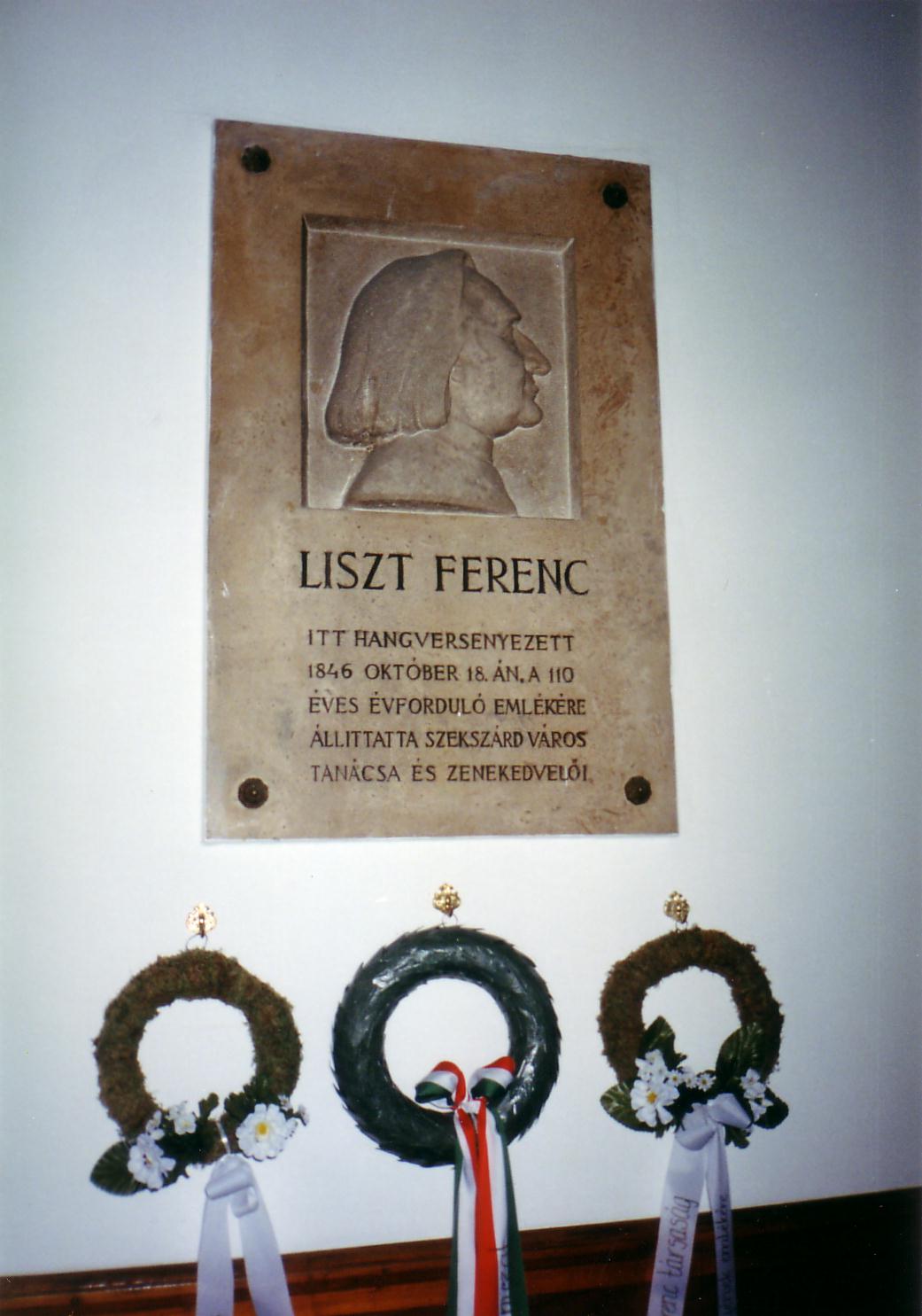 Nyilvános 1205 | 3050 | Rövid leírás | Teljes leírás (1.37 KB) | Szekszárd, Béla tér 1. Megyeháza Az 1799-ben megyeszékhellyé vált Szekszárd közigazgatási központját, a Megyeházát 1828–1833 között építették Pollack Mihály tervei szerint klaszicista stílusban. Annakidején a megyeháza kulturális feladatokat is teljesített: ma is meglévő nagy tanácstermében úri bálokat, műkedvelő előadásokat és — ritkábban — hangversenyeket rendeztek. A hangversenyek közül kiemelkedik Liszt Ferenc 1846. október 18-i fellépése. Liszt Ferencet szoros barátság fűzte Augusz Antal szekszárdi földbirtokoshoz, akinek otthonában (lásd: Szekszárd, Széchenyi u. 36-38.) többször is vendégeskedett. A nagyteremben, ahol Liszt játszott, 1956-ban avatták fel emléktábláját. Sajnos, a Wigand Edit által készített portrédombormű Lisztet jóval idősebb korában ábrázolja; a valóságban koncertje után pár nappal lett 35 éves. A Megyeházán tekinthető meg a Wosinszky Mór Múzeum állandó Liszt Ferenc emlékkiállítása (lásd a következő képeket). A fénykép 1999 júliusában készült. Felh. irod.: Vendel–Mohay Lajosné: Liszt–emlékek Szekszárdon. Szekszárd, 1986 Hamburger Klára: Liszt Ferenc és Szekszárd. = Dunatáj 1986. 3. Husek Rezső: Liszt–kultusz Szekszárdon. = Dunatáj 1986. 3. |