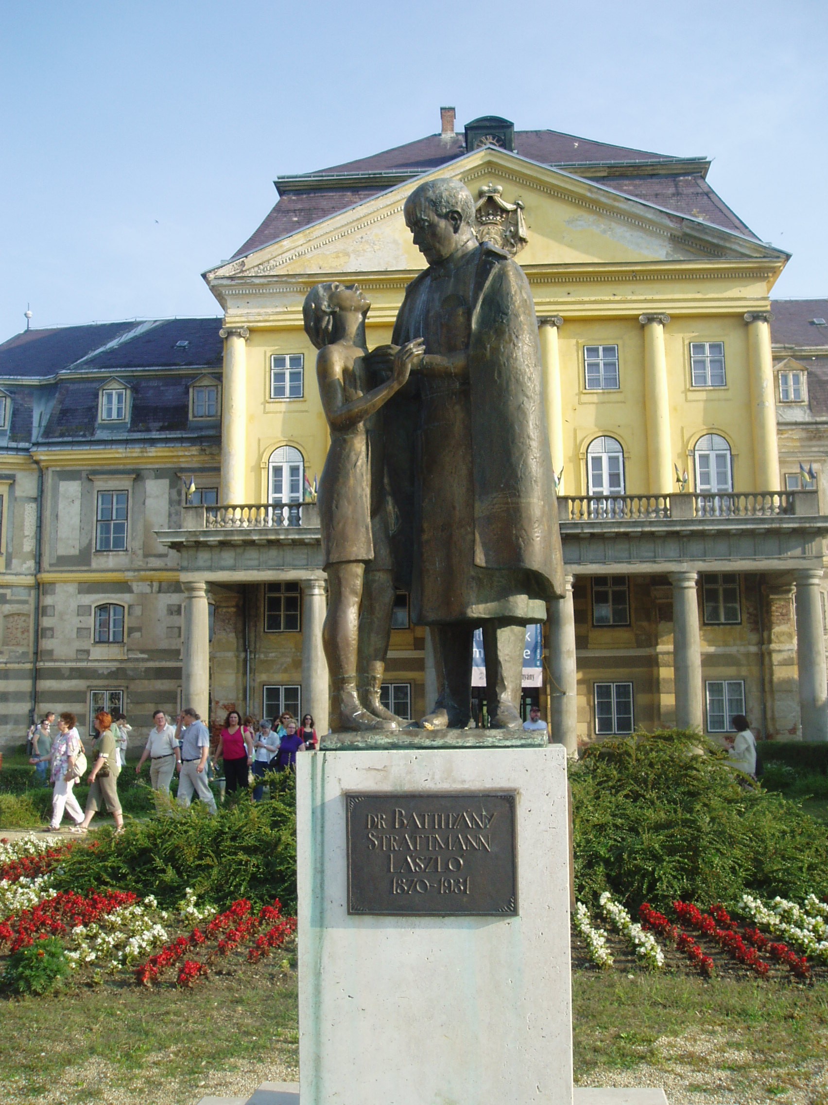 Nyilvános 815 | 1391 | Körmend, Batthyány-kastély | A kastély előtt a 2003-ban boldoggá avatott Batthyány-Strattmann László szobra látható. A szegények orvosát egy kis betegével ábrázoló szobor alkotója Lesenyei Márta. A fénykép 2008 júliusában készült. |