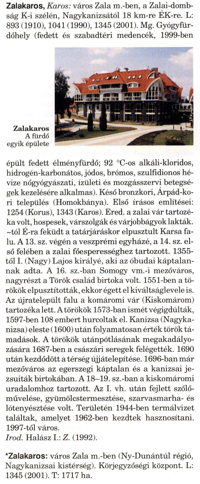 Nyilvános 1342 | 2789 | A szócikkek felismertetett szövege: | (A csillag után a kiegészítő kötetből származó szöveg következik) Zalakaros, Karos: város Zala m.-ben, a Zalai-dombság K-i szélén, Nagykanizsától 18 km-re ÉK-re. L: 893 (1910), 1041 (1990), 1345 (2001). Mg. Gyógyfür-dőhely (fedett és szabadtéri medencék, 1999-ben épült fedett élményfürdő; 92 °C-os alkáli-kloridos, hidrogén-karbonátos, jódos, brómos, szulfidionos hévize nőgyógyászati, ízületi és mozgásszervi betegségek kezelésére alkalmas). Késő bronzkori, Árpád-kori település (Homokbánya). Első írásos említései: 1254 (Korus), 1343 (Karos). Ered. a zalai vár tartozéka volt, hospesek, várszolgák és várjobbágyok lakták. ~tól É-ra feküdt a tatárjáráskor elpusztult Karsa falu. A 13. sz. végén a veszprémi egyházé, a 14. sz. első felében a zalai főesperességhez tartozott. 1355-től I. (Nagy) Lajos királyé, aki az óbudai káptalannak adta. A 16. sz.-ban Somogy vm.-i mezőváros, nagyrészt a Török család birtoka volt. 1551-ben a törökök elpusztították, ekkor égett el kiváltságlevele is. Az újratelepült falu a komáromi vár (Kiskomárom) tartozéka lett. A törökök 1573-ban ismét végigdúlták, 1597-ben 108 embert hurcoltak el. Kanizsa (Nagykanizsa) eleste (1600) után folyamatosan érték török támadások. A törökök utánpótlásának megakadályozására 1687-ben a császári seregek felégették. 1690 után kezdődött a térség újjátelepítése. 1696-ban már mezőváros az egerszegi káptalan és a kanizsai jezsuiták birtokában. A 18—19. sz.-ban a kiskomáromi uradalomhoz tartozott. Az I. vh. után fejlett szőlőművelése, gyümölcstermesztése, szarvasmarha- és lótenyésztése volt. Területén 1944-ben termálvizet találtak, amelyet 1962-ben kezdtek hasznosítani. 1997-től város. Irod. Halász I.: Z. (1992). *Zalakaros: város Zala m.-ben (Ny-Dunántúl régió, Nagykanizsai kistérség). Körjegyzőségi központ. L: 1345 (2001). T: 1717 ha. A szócikkek a következő lexikonból származnak: Cím: Magyar nagylexikon Közreműködő: Élesztős László (1949) (szerk.) ; Barabás Éva (1943) (szerk.) ; Berényi Gábor (1946) (szerk.) ; Bárány Lászlóné (szerk.) ; Adelmann-né Kertész Judit (1945) (közrem.) ; Froemel Károlyné Jáky Éva (1936) (közrem.) ; Akadémiai Kiadó és Nyomda Vállala Szerz. közl.: [... Élesztős László főszerk.] ; [szerk. Barabás Éva et al.] ; [bibliogr. Adelmanné Kertész Judit] ; [kész. az Akadémiai Kiadó Magyar Nagylexikon Szerkesztőségében] Kiadás: Budapest : Akad. K., 1993- Kötetei: 1. köt., A - Anc 2. köt., And - Bag 3. köt., Bah - Bij 4. köt., Bik - Bz 5. köt., C - Csem 6. köt., Csen - Ec 7. köt., Ed - Fe 8. köt., Ff - Gyep 9. köt., Gyer - Iq 10. köt., Ir - Kip 11. köt., Kir - Lem 12. köt., Len - Mep 13. köt., Mer - Nyk 14. köt., Nyl - Pom 15. köt., Pon - Sek 16. köt., Sel - Szö 17. köt., Szp - Ung 18. köt., Unh - Z 19. köt., Kiegészítő kötet, A - Z ETO jelzet: 030=945.11 Szakjelzet: 030 Cutter: M 14 ISBN: 963-05-6611-7 [!ISBN 963-05-6615-X] Nyelv: magyar Megjegyzés: Az 5. kötettől kiad. a Magyar Nagylexikon Kiadó ; A 6. kötettől főszerk. Berényi Gábor ; A 6. kötettől szakszerk. Bárány Lászlóné et al. ; A 6. kötettől bibliogr. Froemel Károlyné ; Bibliogr. a szócikkek végén |