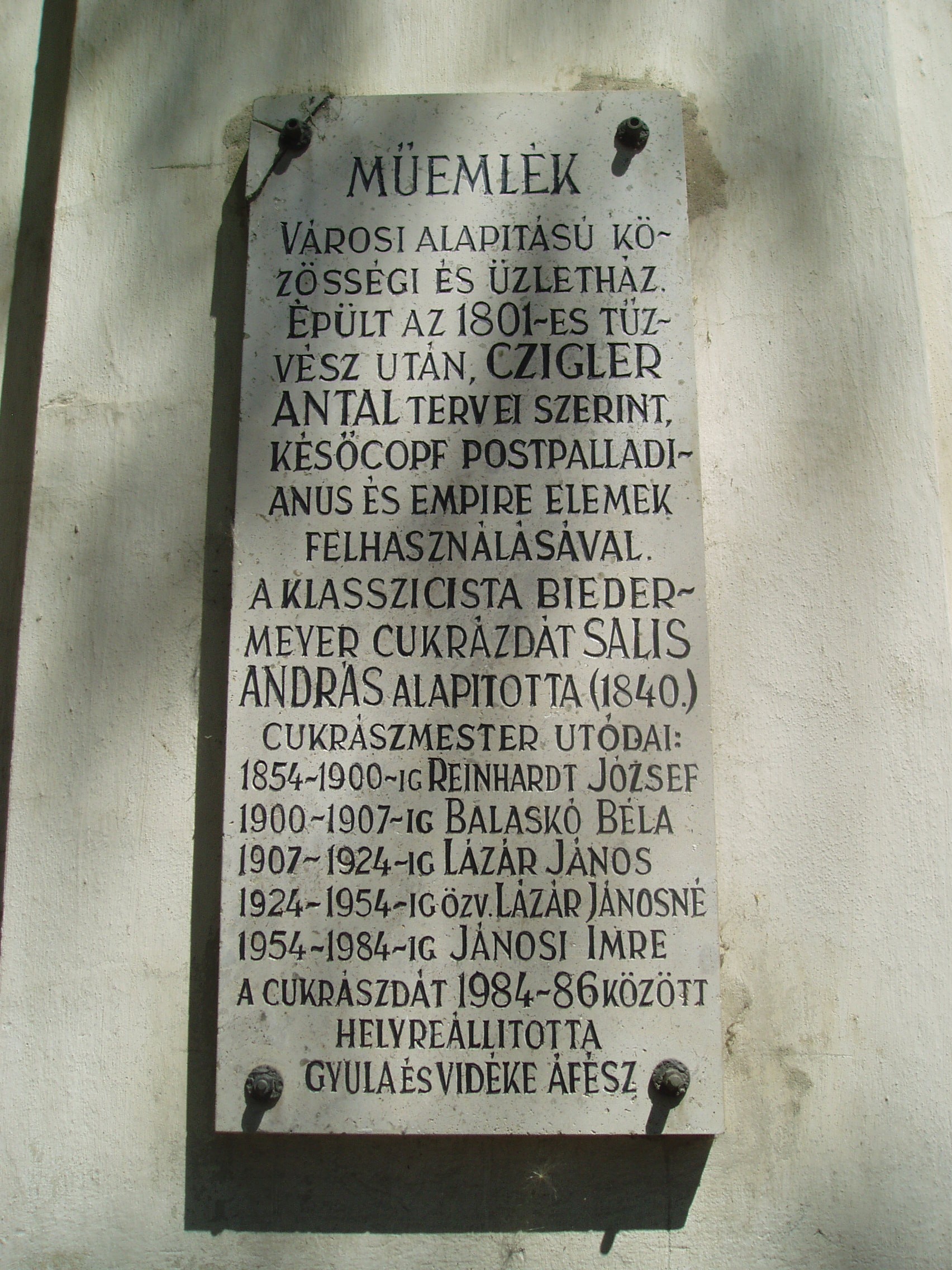 Nyilvános 1091 | 2477 | Gyula, Erkel tér 1. Százéves cukrászda | 1801-ben, a nagy tűzvész után épült az egyemeletes, L alakú, műemlékké nyilvánított ház. Erkel térre néző oldala copf- és empire stílusú, a Jókai utca felőli részen klasszicista elemek is felfedezhetők. Műemléki megítélés szerint "korát és színvonalát tekintve a Dél-Alföld legértékesebb emeletes polgárháza". Földszintjén található a megye legrégibb, s az ország egyik legnevezetesebb műemléki cukrászdája, mely bizonyíthatóan legalább 1840 óta fennáll. XIX. századi tulajdonosáról eredetileg Reinhardt-cukrászdának nevezték. A cukrászda elkerülte az államosítást, megőrizték régi berendezését, s a helyiségek reformkori hangulatát. Az udvar felőli folyosón az egykori szabadkéményes cukrászműhely felszereléseit, eszközeit bemutató kiállítás látható. A fénykép 2007 júliusában készült. Felh. irod.: Czeglédi Imre: Gyula útikalauz. 2. bőv. kiad. Gyula, 1995 |