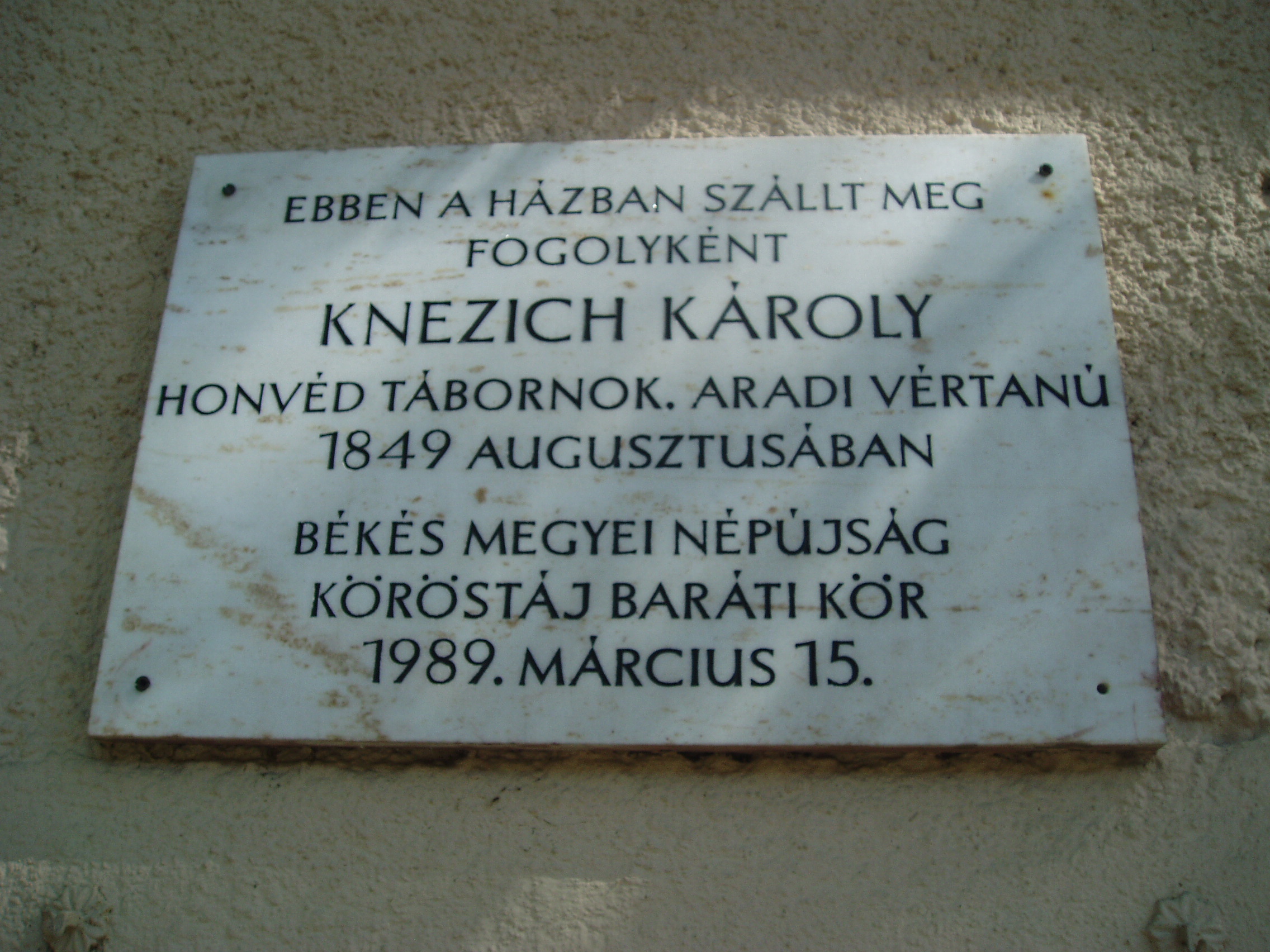 Nyilvános 768 | 1179 | Gyula, Jókai utca 8. Czégényi-ház | Ebben a házban volt elszállásolva 1849. augusztusában Knezich Károly honvéd tábornok, az aradi vértanúk egyike. A lefegyverzéskor kardját Czégényi nevű házigazdájának adta át, s ma a gyulai múzeum becses tulajdona. A szabadságharc tragikus gyulai eseményét lásd: Gyula, Várkert: Honvédtiszti emlékhely. A fénykép 2007 júliusában készült. Felh. irod.: Czeglédi Imre: Gyula útikalauz. 2. jav., bőv. kiad. Gyula, 1995 |