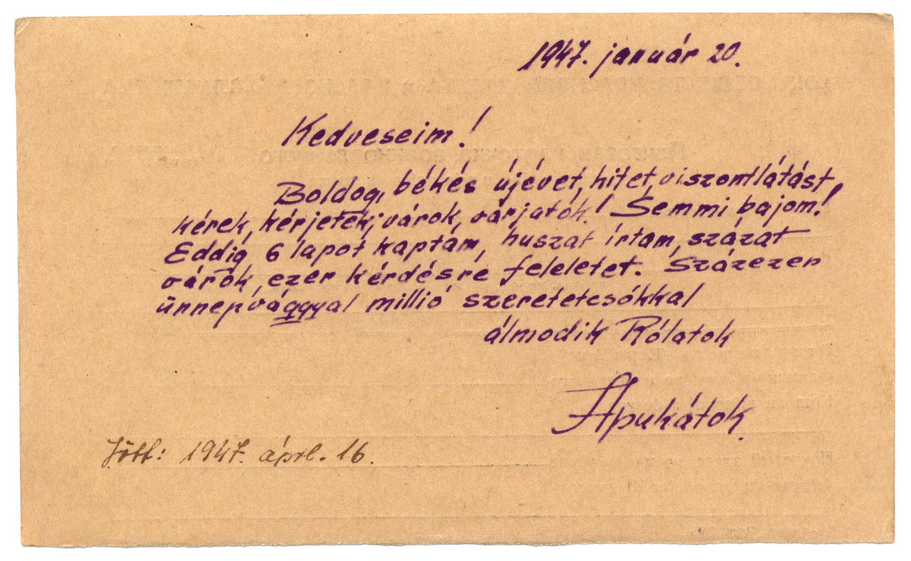 Nyilvános 1055 | 2047 | Vértes Imréné | Letenye IV. - Zala vm. Magyarország Vértes Imre hdgy. ... C.C.C.P. "Moszkva" Vöröskereszt, Postafiók 430/1. c. ... 1947. január 20. Kedveseim! Boldog, békés újévet, hitet, viszontlátást kérek, kérjetek; várok, várjatok! Semmi bajom! Eddig 6 lapot kaptam, huszat írtam, százat várok, ezer kérdésre feleletet. Százezer ünnepvággyal millió szeretetcsókkal álmodik Rólatok Apukátok Jött: 1947. áprl. 16. |