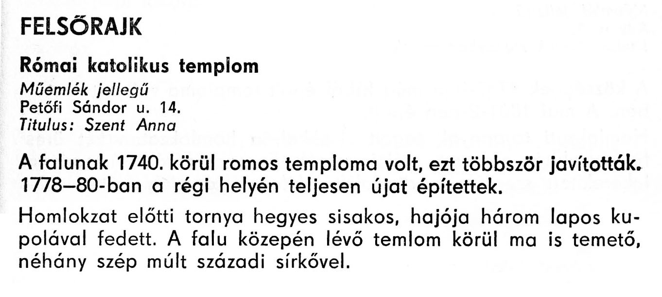Nyilvános 1782 | 3758 | Felsőrajk - Zala megye műemlékei 1977 055-056old | A részlet szövege: FELSŐRAJK Római katolikus templom Műemlék jellegű Petőfi Sándor u. 14. Titulus: Szent Anna A falunak 1740. körül romos temploma volt, ezt többször javították. 1778–80-ban a régi helyén teljesen újat építettek. Homlokzat előtti tornya hegyes sisakos, hajója három lapos kupolával fedett. A falu közepén lévő temlom körül ma is temető, néhány szép múlt századi sírkővel. A részlet a következő könyvből származik: Cím: Zala megye műemlékei Szerző: Németh József (1928) Közreműködő: Lantos Miklós (fotó) Szerz. közl.: Németh József ; [fotók... Lantos Miklós] Kiadás: Zalaegerszeg : Zalai Ny., 1977 ETO jelzet: 72(439.121) ; 7.025.3/.4 ; 908.439.121 Tárgyszó: Zala megye Szakjelzet: 908 Cutter: N 53 Nyelv: magyar Oldalszám: 109 p. |