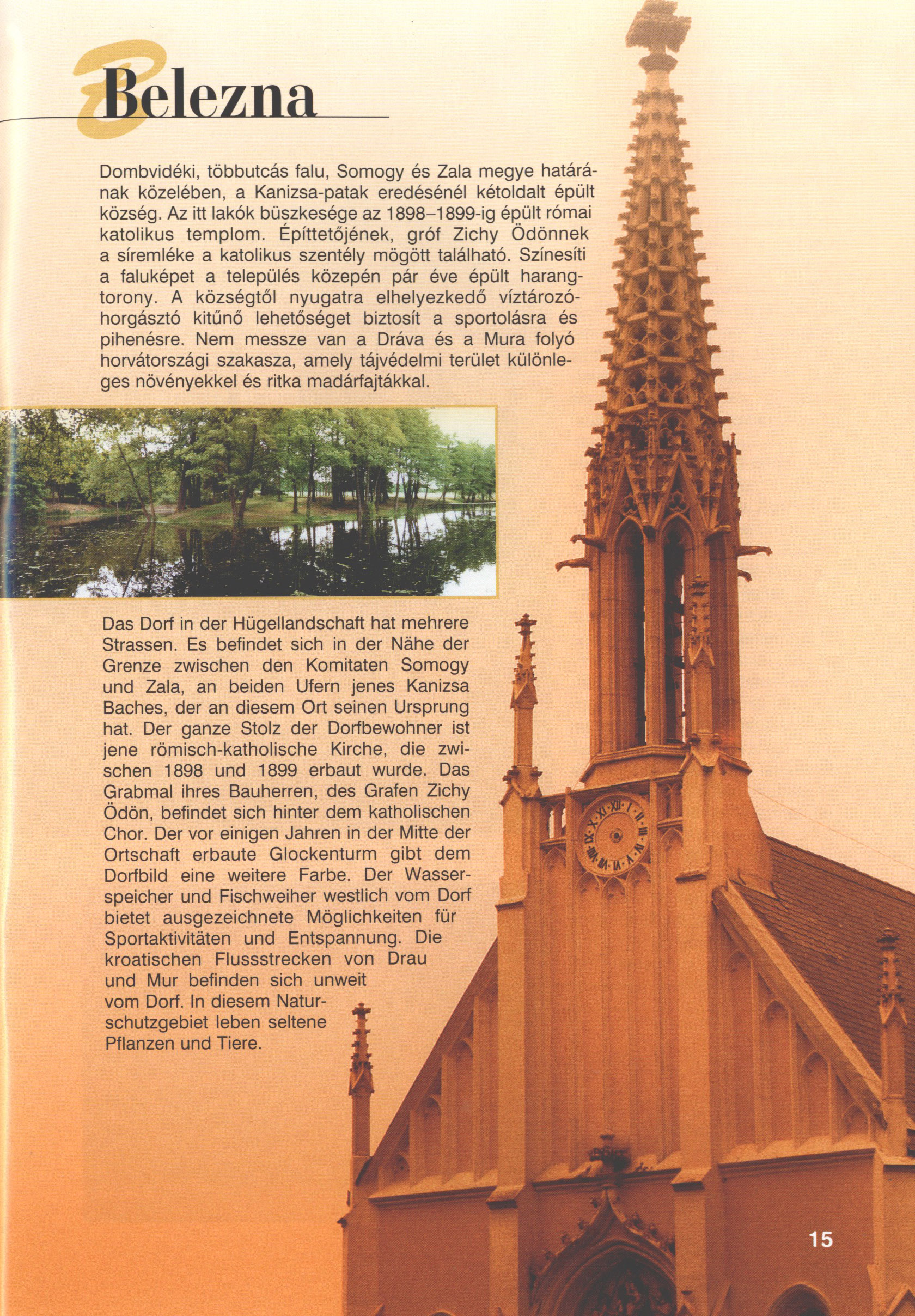 Nyilvános 2040 | 7009 | Belezna | Das Dorf in der Hügellandschaft hat mehrere Strassen. Es befindet sich in der Nähe der Grenze zwischen den Komitaten Somogy und Zala, an beiden Ufern jenes Kanizsa Baches, der an diesem Ort seinen Ursprung hat. Der ganze Stolz der Dorfbewohner ist jene römisch-katholische Kirche, die zwischen 1898 und 1899 erbaut wurde. Das Grabmal ihres Bauherren, des Grafen Zichy Ödön, befindet sich hinter dem katholischen Chor. Der vor einigen Jahren in der Mitte der Ortschaft erbaute Glockenturm gibt dem Dorfbild eine weitere Farbe. Der Wasserspeicher und Fischweiher westlich vom Dorf bietet ausgezeichnete Möglichkeiten für Sportaktivitäten und Entspannung. Die kroatischen Flussstrecken von Drau und Mur befinden sich unweit vom Dorf. In diesem Naturschutzgebiet leben seltene Pflanzen und Tiere. Dieses Text stammt von: Titel: Hívogató a Régiók Kapujában - Útikönyv Látnivalók Nagykanizsán és Térségében (Einladend in dem Tor des Gebiets - Reisebuch - Sehenswürdigkeiten in Nagykanizsa und Umgebung) Herausgegeben von: Nagykanizsa és a Környező Települések Területfejlesztési Társulása (Verein für Gebietsentwicklung in Nagykanizsa und in ihrer Umgebung) 8800 Nagykanizsa, Petőfi Sándor út 5. Tel.: 06 93/536-453 • 06 93/536-454 Tel ./Fax: 06 93/326-323 E-mail: terstars@axelero.hu www.kanizsaterseg.celodin.hu |