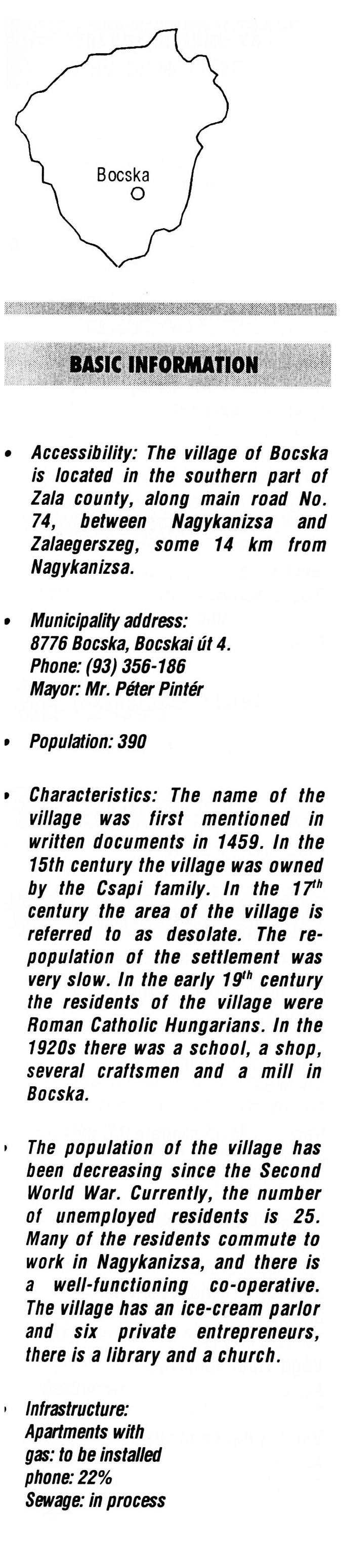 Nyilvános 1965 | 5644 | Rövid leírás | Teljes leírás (1.67 KB) | Bocska BASIC INFORMATION Accessibility: The village of Bocska is located in the southern part of Zala county, along main road No. 74, between Nagykanizsa and Zalaegerszeg, some 14 km from Nagykanizsa. Municipality address: 8776 Bocska, Bocskai út 4. Phone: (93) 356-186 Mayor: Mr. Péter Pintér Population: 390 Characteristics: The name of the village was first mentioned in written documents in 1459. In the 15th century the village was owned by the Csapi family. In the 17th century the area of the village is referred to as desolate. The re-population of the settlement was very slow. In the early 19th century the residents of the village were Roman Catholic Hungarians. In the 1920s there was a school, a shop, several craftsmen and a mill in Bocska. The population of the village has been decreasing since the Second World War. Currently, the number of unemployed residents is 25. Many of the residents commute to work in Nagykanizsa, and there is a well-functioning co-operative. The village has an ice-cream parlor and six private entrepreneurs, there is a library and a church. Infrastructure: Apartments with gas: to be installed phone: 22% Sewage: in process This text came from the following book: Title: Handbook of Zala county (Zala megye kézikönyve) Series: County handbooks of Hungary (Magyarország megyei kézikönyvei) Chief editor: Hóbor József Publisher: (Hatvan), CEBA-Hungary Ltd, 1998 ETO: 908.439.121(035) ; 050.8(439.121) ISBN: 963-9089-18-2 Pages: 488-1040 p. Remark: Closed on: 1998. márc. 31. |