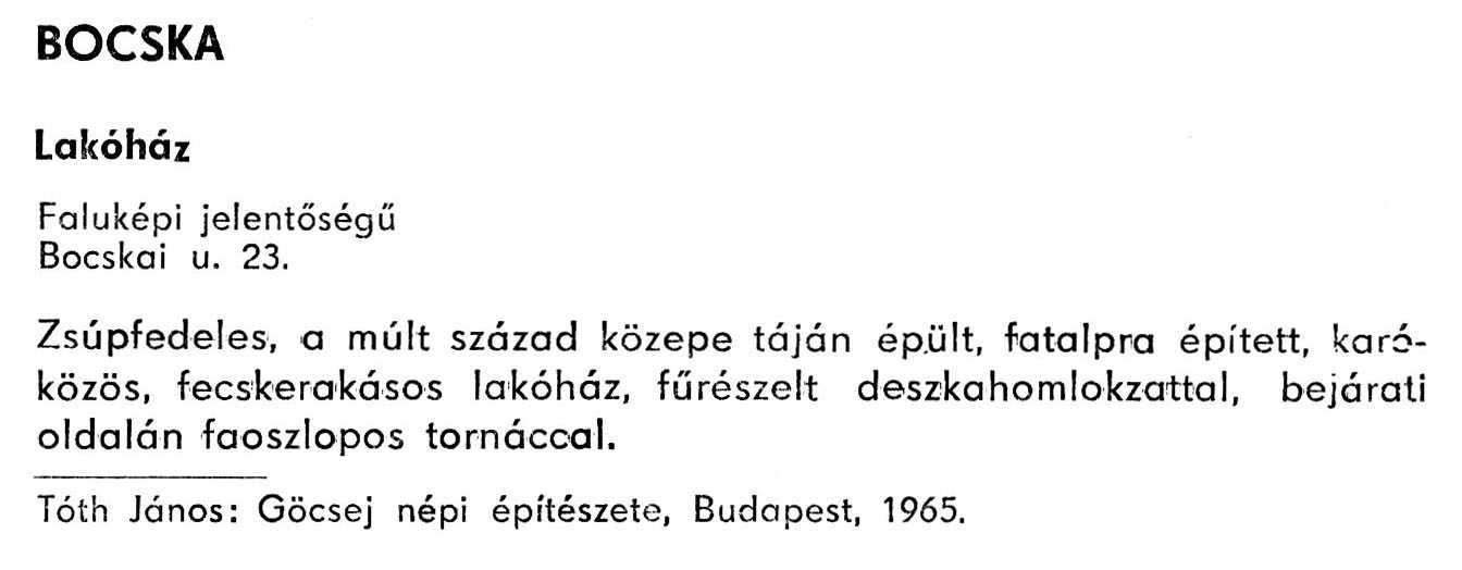Nyilvános 1904 | 5466 | Bocska - Zala megye műemlékei 1979 058old | A részlet szövege: BOCSKA Lakóház Faluképi jelentőségű Bocskai u. 23. Zsúpfedeles, a múlt század közepe táján épült, fatalpra épített, karóközös, fecskerakásos lakóház, fűrészelt deszkahomlokzattal, bejárati oldalán faoszlopos tornáccal. Tóth János: Göcsej népi építészete, Budapest, 1965. A részlet a következő könyvből származik: Cím: Zala megye műemlékei Szerző: Németh József (1928) Közreműködő: Vándor László (szerk.) ; Szabóky Zsolt (1941) (fotó) Szerz. közl.: Németh József ; [szerk. Vándor László] ; [fotók... Szabóky Zsolt] Kiadás jelzés: 2. bőv. kiad. Kiadás: Zalaegerszeg : Zalai Ny., 1979 ETO jelzet: 72(439.121) ; 7.025.3/.4(439.121) ; 908.439.121 Tárgyszó: Zala Szakjelzet: 908 Cutter: N 53 Nyelv: magyar Oldalszám: 134 p. |