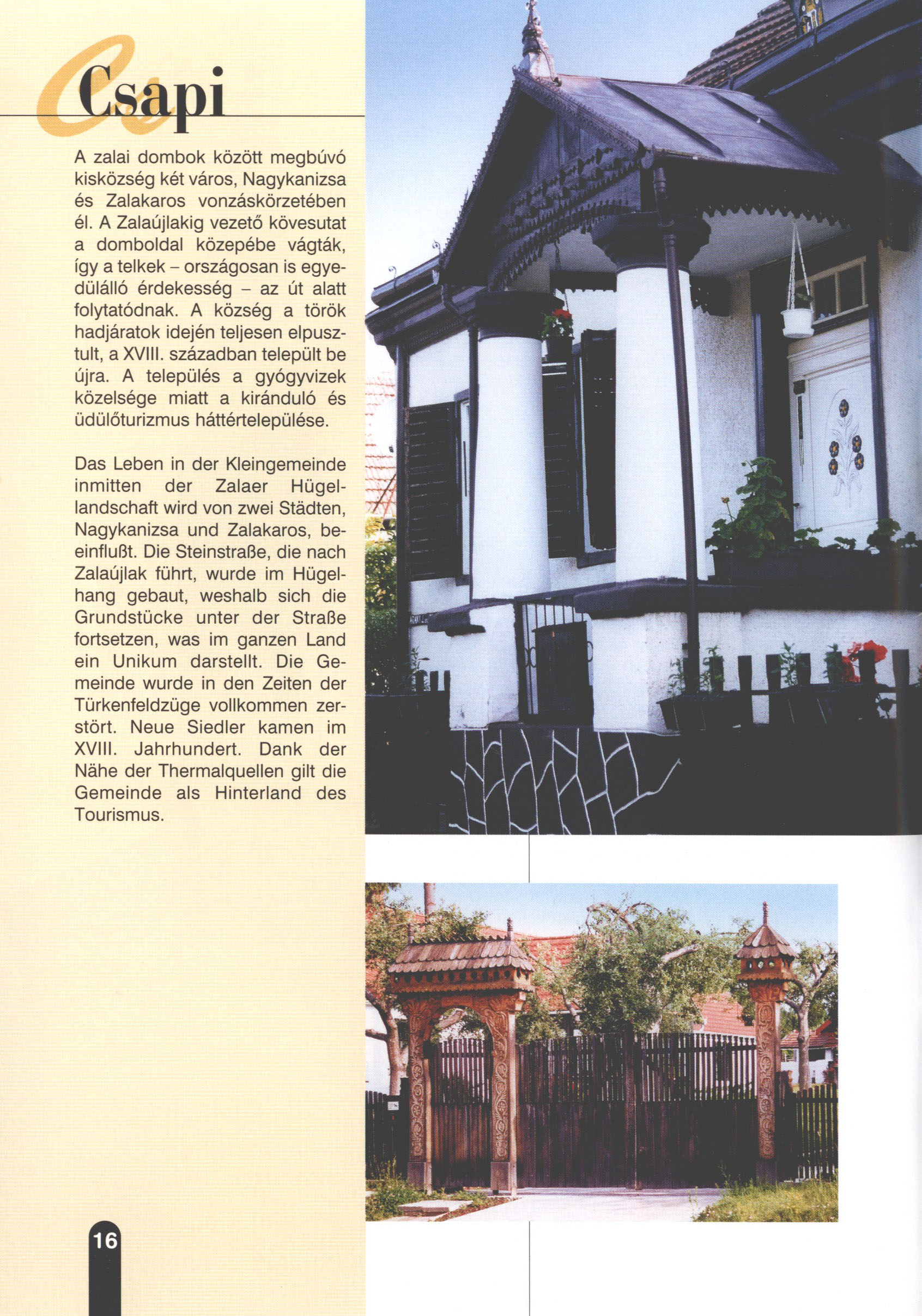 Nyilvános 1909 | 5845 | Csapi | Das Leben in der Kleingemeinde inmitten der Zalaer Hügellandschaft wird von zwei Städten, Nagykanizsa und Zalakaros, beeinflußt. Die Steinstraße, die nach Zalaújlak führt, wurde im Hügelhang gebaut, weshalb sich die Grundstücke unter der Straße fortsetzen, was im ganzen Land ein Unikum darstellt. Die Gemeinde wurde in den Zeiten der Türkenfeldzüge vollkommen zerstört. Neue Siedler kamen im XVIII. Jahrhundert. Dank der Nähe der Thermalquellen gilt die Gemeinde als Hinterland des Tourismus. Dieses Text stammt von: Titel: Hívogató a Régiók Kapujában - Útikönyv Látnivalók Nagykanizsán és Térségében (Einladend in dem Tor des Gebiets - Reisebuch - Sehenswürdigkeiten in Nagykanizsa und Umgebung) Herausgegeben von: Nagykanizsa és a Környező Települések Területfejlesztési Társulása (Verein für Gebietsentwicklung in Nagykanizsa und in ihrer Umgebung) 8800 Nagykanizsa, Petőfi Sándor út 5. Tel.: 06 93/536-453 • 06 93/536-454 Tel ./Fax: 06 93/326-323 E-mail: terstars@axelero.hu www.kanizsaterseg.celodin.hu |