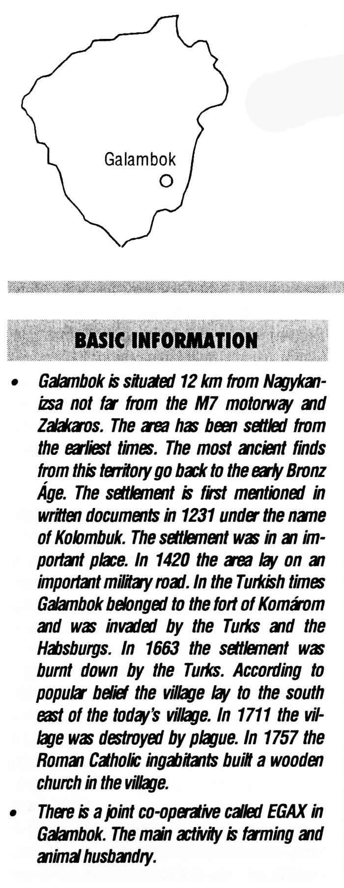 Nyilvános 2033 | 6114 | Galambok | BASIC INFORMATION Galambok is situated 12 km from Nagykanizsa not far from the M7 motorway and Zalakaros. The area has been settled from the earliest times. The most ancient finds from this territory go back to the early Bronz Age. The settlement is first mentioned in written documents in 1231 under the name of Kolombuk. The settlement was in an important place. In 1420 the area lay on an important military road. In the Turkish times Galambok belonged to the fort of Komárom and was invaded by the Turks and the Habsburgs. In 1663 the settlement was burnt down by the Turks. According to popular belief the village lay to the south east of the today\'s village. In 1711 the village was destroyed by plague. In 1757 the Roman Catholic ingabitants built a wooden church in the village. There is a joint co-operative called EGAX in Galambok. The main activity is farming and animal husbandry. This text came from the following book: Title: Handbook of Zala county (Zala megye kézikönyve) Series: County handbooks of Hungary (Magyarország megyei kézikönyvei) Chief editor: Hóbor József Publisher: (Hatvan), CEBA-Hungary Ltd, 1998 ETO: 908.439.121(035) ; 050.8(439.121) ISBN: 963-9089-18-2 Pages: 488-1040 p. Remark: Closed on: 1998. márc. 31. |