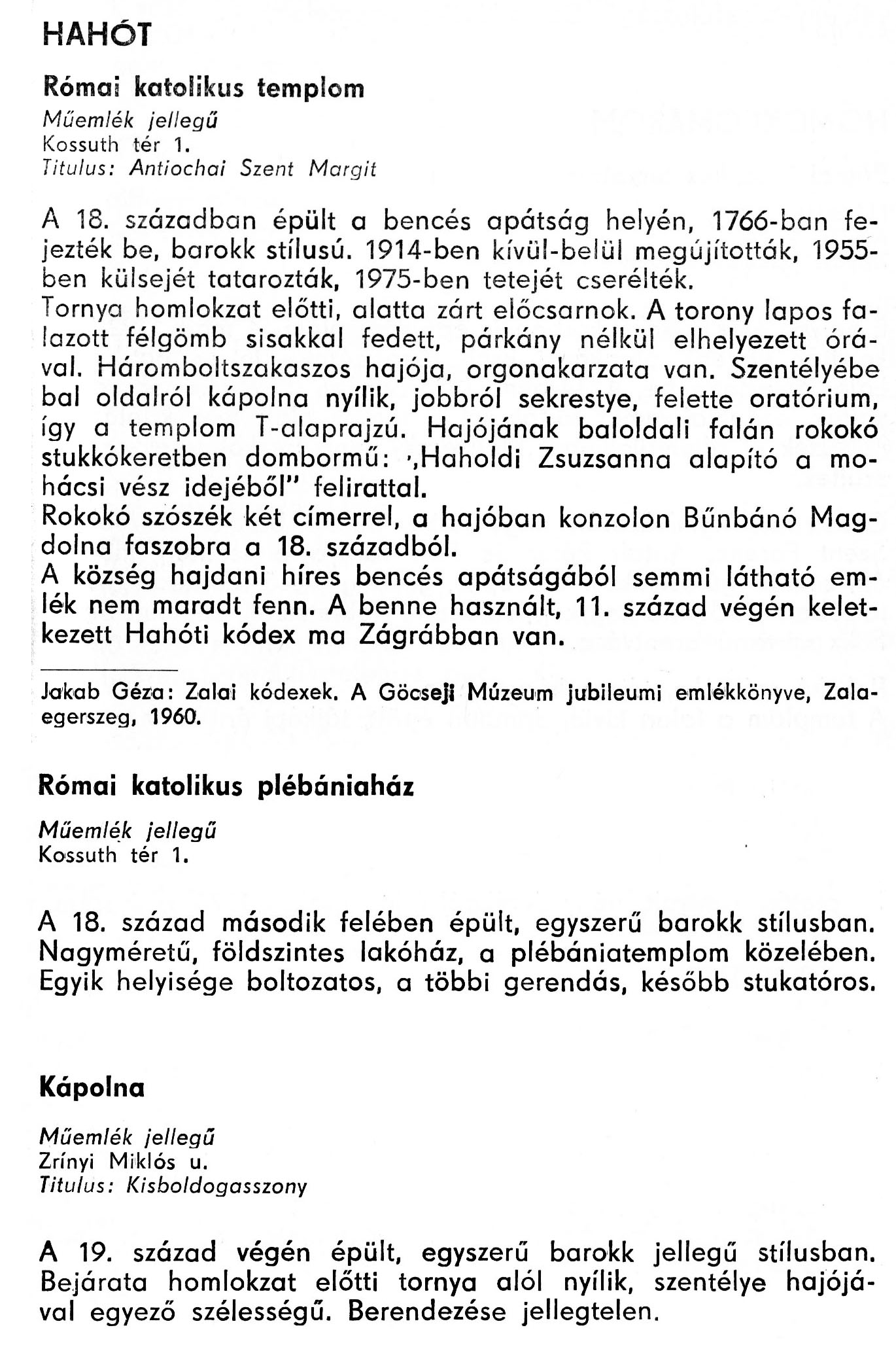 Nyilvános 1954 | 5484 | Rövid leírás | Teljes leírás (2.34 KB) | Hahót - Zala megye műemlékei 1977 059-060old A részlet szövege: HAHÓT Római katolikus templom Műemlék jellegű Kossuth tér 1. Titulus: Antiochai Szent Margit A 18. században épült a bencés apátság helyén, 1766-ban fejezték be, barokk stílusú. 1914-ben kívül-belül megújították, 1955-ben külsejét tatarozták, 1975-ben tetejét cserélték. Tornya homlokzat előtti, alatta zárt előcsarnok. A torony lapos falazott félgömb sisakkal fedett, párkány nélkül elhelyezett órával. Háromboltszakaszos hajója, orgonakarzata van. Szentélyébe bal oldalról kápolna nyílik, jobbról sekrestye, felette oratórium, így a templom T-alaprajzú. Hajójának baloldali falán rokokó stukkókeretben dombormű: "Haholdi Zsuzsanna alapító a mohácsi vész idejéből" felirattal. Rokokó szószék két címerrel, a hajóban konzolon Bűnbánó Magdolna faszobra a 18. századból. A község hajdani híres bencés apátságából semmi látható emlék nem maradt fenn. A benne használt, 11. század végén keletkezett Hahóti kódex ma Zágrábban van. Jakab Géza: Zalai kódexek. A Göcseji Múzeum jubileumi emlékkönyve, Zalaegerszeg, 1960. Római katolikus plébániaház Műemlék jellegű Kossuth tér 1. A 18. század második felében épült, egyszerű barokk stílusban. Nagyméretű, földszintes lakóház, a plébániatemplom közelében. Egyik helyisége boltozatos, a többi gerendás, később stukatóros. Kápolna Műemlék jellegű Zrínyi Miklós u. Titulus: Kisboldogasszony A 19. század végén épült, egyszerű barokk jellegű stílusban. Bejárata homlokzat előtti tornya alól nyílik, szentélye hajójával egyező szélességű. Berendezése jellegtelen. A részlet a következő könyvből származik: Cím: Zala megye műemlékei Szerző: Németh József (1928) Közreműködő: Lantos Miklós (fotó) Szerz. közl.: Németh József ; [fotók... Lantos Miklós] Kiadás: Zalaegerszeg : Zalai Ny., 1977 ETO jelzet: 72(439.121) ; 7.025.3/.4 ; 908.439.121 Tárgyszó: Zala megye Szakjelzet: 908 Cutter: N 53 Nyelv: magyar Oldalszám: 109 p. |