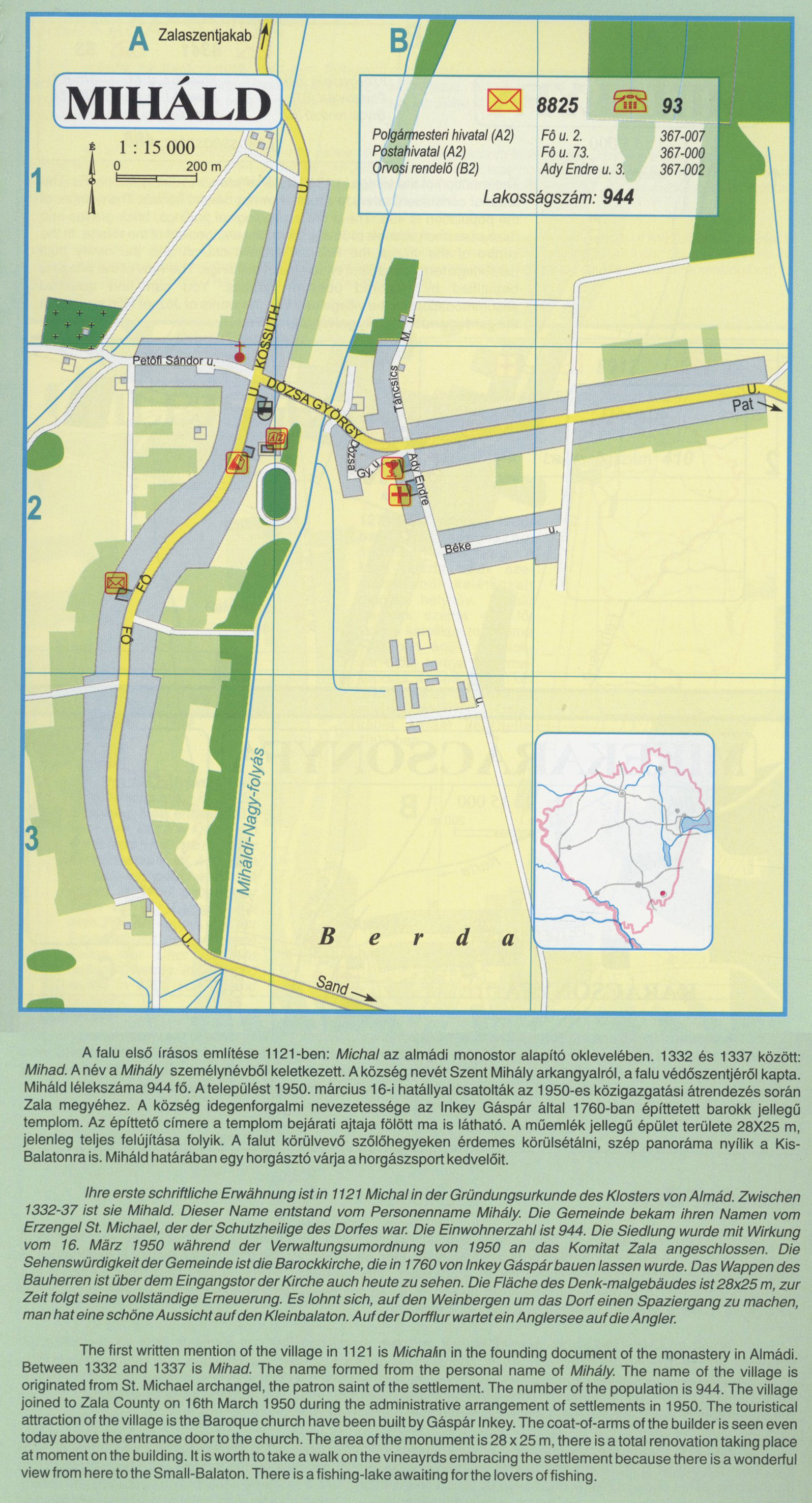 Nyilvános 2024 | 7672 | Rövid leírás | Teljes leírás (3.42 KB) | MIHÁLD A falu első írásos említése 1121-ben: Michal az almádi monostor alapító oklevelében. 1332 és 1337 között: Mihad. A név a Mihály személynévből keletkezett. A község nevét Szent Mihály arkangyalról, a falu védőszentjéről kapta. Miháld lélekszáma 944 fő. A települést 1950. március 16-i hatállyal csatolták az 1950-es közigazgatási átrendezés során Zala megyéhez. A község idegenforgalmi nevezetessége az Inkey Gáspár által 1760-ban építtetett barokk jellegű templom. Az építtető címere a templom bejárati ajtaja fölött ma is látható. A műemlék jellegű épület területe 28X25 m, jelenleg teljes felújítása folyik. A falut körülvevő szőlőhegyeken érdemes körülsétálni, szép panoráma nyílik a Kis-Balatonra is. Miháld határában egy horgásztó várja a horgászsport kedvelőit. Ihre erste schriftliche Erwähnung ist in 1121 Michal in der Gründungsurkunde des Klosters von Almád. Zwischen 1332-37 ist sie Mihald. Dieser Name entstand vom Personenname Mihály. Die Gemeinde bekam ihren Namen vom Erzengel St. Michael, der der Schutzheilige des Dorfes war. Die Einwohnerzahl ist 944. Die Siedlung wurde mit Wirkung vom 16. März 1950 während der Verwaltungsumordnung von 1950 an das Komitat Zala angeschlossen. Die Sehenswürdigkeit der Gemeinde ist die Barockkirche, die in 1760 von Inkey Gáspár bauen lassen wurde. Das Wappen des Bauherren ist über dem Eingangstor der Kirche auch heute zu sehen. Die Fläche des Denk-malgebäudes ist 28x25 m, zur Zeit folgt seine vollständige Erneuerung. Es lohnt sich, auf den Weinbergen um das Dorf einen Spaziergang zu machen, man hat eine schöne Aussicht auf den Kleinbalaton. Auf der Dorfflur wartet ein Anglersee auf die Angler. The first written mention of the village in 1121 is Michalin in the founding document of the monastery in Almádi. Between 1332 and 1337 is Mihad. The name formed from the personal name of Mihály. The name of the village is originated from St. Michael archangel, the patron saint of the settlement. The number of the population is 944. The village joined to Zala County on 16th March 1950 during the administrative arrangement of settlements in 1950. The touristical attraction of the village is the Baroque church have been built by Gáspár Inkey. The coat-of-arms of the builder is seen even today above the entrance door to the church. The area of the monument is 28 x 25 m, there is a total renovation taking place at moment on the building. It is worth to take a walk on the vineayrds embracing the settlement because there is a wonderful view from here to the Small-Balaton. There is a fishing-lake awaiting for the lovers of fishing. A részlet a következő kiadványból származik/Die Teile stammen vom volgenden Buch/This text came from the following book: Cím/Titel/Title: Zala megye településeinek atlasza - 257 település részletes térképe/Atlas der Komitat Zala - 257 Detailte Siedlungskarten/Zala county\'s Atlas - 257 settlement maps. Közreműködő/contributor: Lackner László (1943) (fotó) Kiadás/Ausgabe/Publisher: Gyula : HISZI-MAP, 1997 Sorozat/Serie/Series: Indulástól - megérkezésig... ETO: 912(439.121-2) ; 908.439.121 Cutter: Z 19 ISBN: 963-610-025-4 Oldalszám/Seiten/Pages: 323, 81 p. Megjegyzés/Note: Lezárva/Abgeschlossen am/Closed am: 1997. máj. 30. |