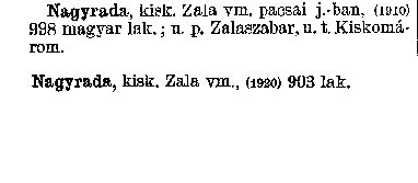 Nyilvános 1677 | 4762 | Rövid leírás | Teljes leírás (1.08 KB) | Nagyrada kisk. Zala vm. pacsai j. -ban, (1910) 998 magyar lak.; u. p. Zalaszabar, u. t. Kiskomárom. Nagyrada kisk. Zala vm., (1920) 903 lak. Cím: Révai nagy lexikona Alcím: az ismeretek enciklopédiája Kiadás: Budapest : Révai testvérek, [1911]- Kötetei: 1. köt., A - Arany 2. köt., Arány - Beke 3. köt., Béke - Brutto 4. köt., Bratus - Csát 5. köt., Csata - Duc 6. köt., Duc - Etele 7. köt., Stelka - Földöv 8. köt., Földpálya - Gres 9. köt., Gréc - Herold 10. köt., Hérold - Jób 11. köt., Jób - Nontur 12. köt., Kontúr - Lovas 13. köt., Lovas - Mons 14. köt., Mens - Ottó 15. köt., Ottó - Racine 16. köt., Racine - Sodoma 17. köt., Sodoma - Tarján 18. köt., 19. köt., Vár - Zsüri | Kiegészítés Aachen - Beöthy 20. köt., Kiegészítés: Bér - Zsolt ETO jelzet: 03=945.11 Szakjelzet: 030 Cutter: R 62 Nyelv: magyar |