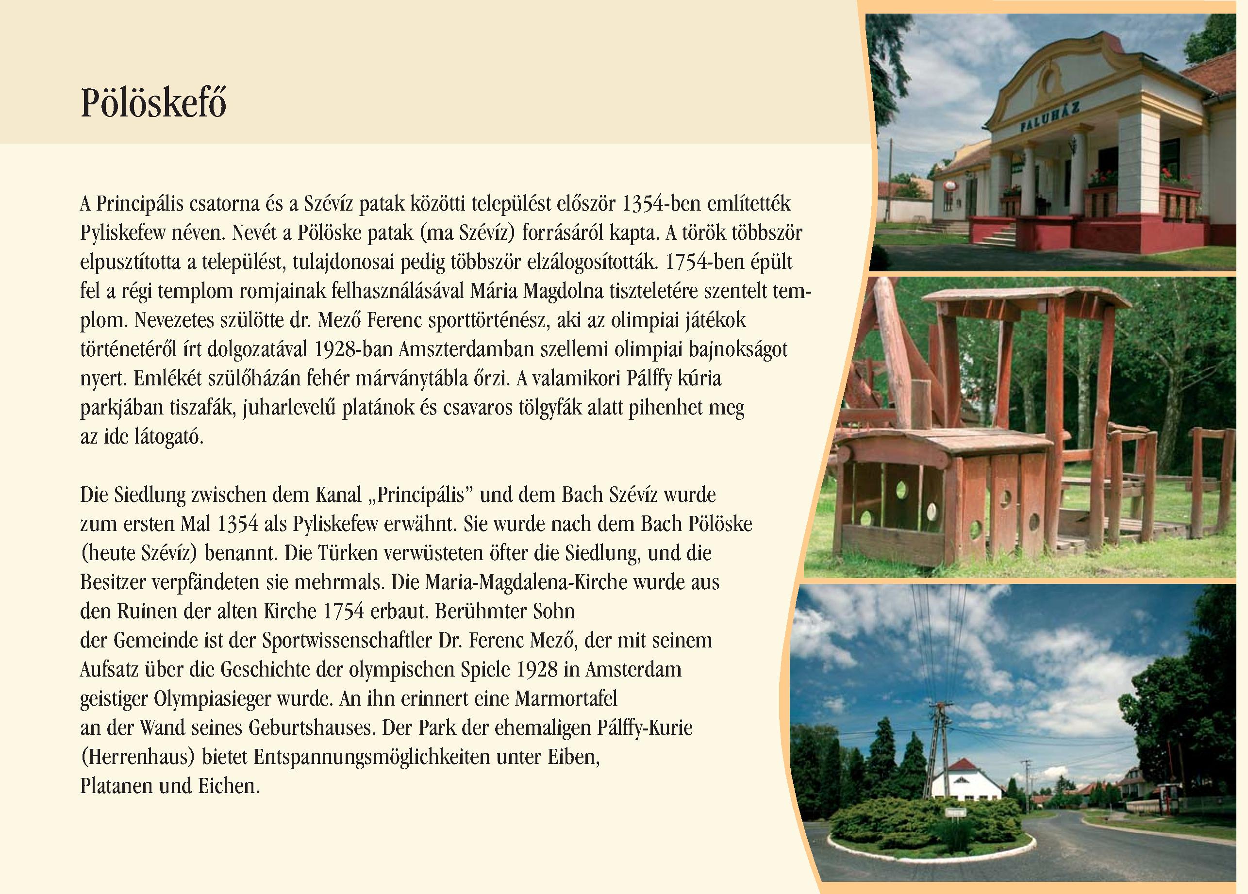 Nyilvános 2015 | 5817 | Pölöskefő | Die Siedlung zwischen dem Kanal ,,Principális" und dem Bach Szévíz wurde zum ersten Mal 1354 als Pyliskefew erwähnt. Sie wurde nach dem Bach Pölöske (heute Szévíz) benannt. Die Türken verwüsteten öfter die Siedlung, und die Besitzer verpfändeten sie mehrmals. Die Maria-Magdalena-Kirche wurde aus den Ruinen der alten Kirche 1754 erbaut. Berühmter Sohn der Gemeinde ist der Sportwissenschaftler Dr. Ferenc Mező, der mit seinem Aufsatz über die Geschichte der olympischen Spiele 1928 in Amsterdam geistiger Olympiasieger wurde. An ihn erinnert eine Marmortafel an der Wand seines Geburtshauses. Der Park der ehemaligen Pálffy-Kurie (Herrenhaus) bietet Entspannungsmöglichkeiten unter Eiben, Platanen und Eichen. Dieses Text stammt von: Pannonhát tájpark prospektus 2006. Web: http://www.pannonhat.hu/ (auch in Deutsch) |