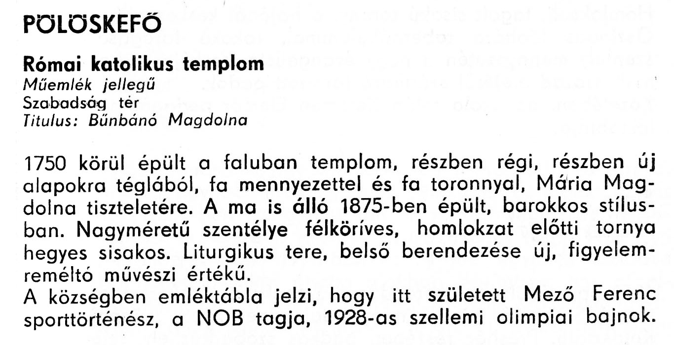 Nyilvános 1898 | 4934 | Pölöskefő - Zala megye műemlékei 1977 081old | A részlet szövege: PÖLÖSKEFÖ Római katolikus templom Műemlék jellegű Szabadság tér Titulus: Bűnbánó Magdolna 1750 körül épült a faluban templom, részben régi, részben új alapokra téglából, fa mennyezettel és fa toronnyal, Mária Magdolna tiszteletére. A ma is álló 1875-ben épült, barokkos stílusban. Nagyméretű szentélye félköríves, homlokzat előtti tornya hegyes sisakos. Liturgikus tere, belső berendezése új, figyelemreméltó művészi értékű. A községben emléktábla jelzi, hogy itt született Mező Ferenc sporttörténész, a NOB tagja, 1928-as szellemi olimpiai bajnok. A részlet a következő könyvből származik: Cím: Zala megye műemlékei Szerző: Németh József (1928) Közreműködő: Lantos Miklós (fotó) Szerz. közl.: Németh József ; [fotók... Lantos Miklós] Kiadás: Zalaegerszeg : Zalai Ny., 1977 ETO jelzet: 72(439.121) ; 7.025.3/.4 ; 908.439.121 Tárgyszó: Zala megye Szakjelzet: 908 Cutter: N 53 Nyelv: magyar Oldalszám: 109 p. |