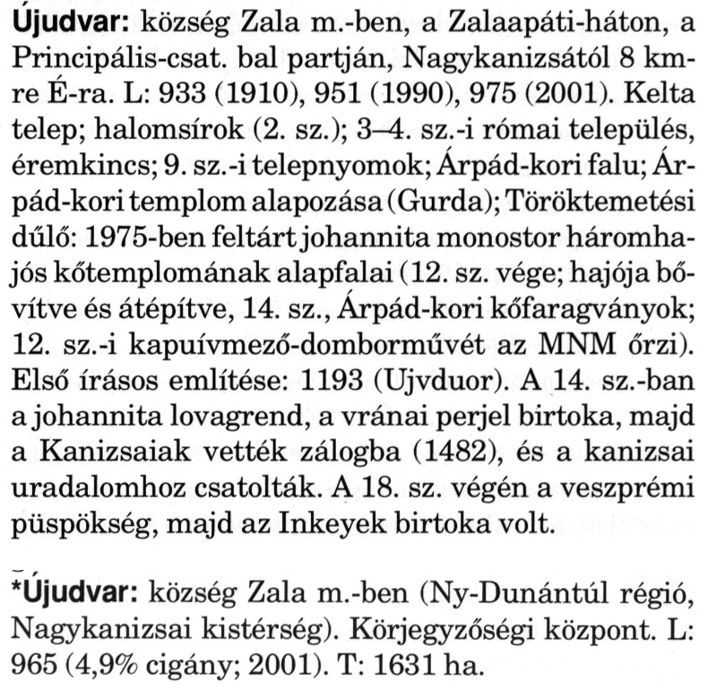 Nyilvános 1792 | 5346 | A szócikkek felismertetett szövege: | (A csillag után a kiegészítő kötetből származó szöveg következik) Újudvar: község Zala m.-ben, a Zalaapáti-háton, a Principális-csat. bal partján, Nagykanizsától 8 km-re É-ra. L: 933 (1910), 951 (1990), 975 (2001). Kelta telep; halomsírok (2. sz.); 3-4. sz.-i római település, éremkincs; 9. sz.-i telepnyomok; Árpád-kori falu; Árpád-kori templom alapozása (Gurda); Töröktemetési dűlő: 1975-ben feltárt johannita monostor háromhajós kőtemplomának alapfalai (12. sz. vége; hajója bővítve és átépítve, 14. sz., Árpád-kori kőfaragványok; 12. sz.-i kapuívmező-domborművét az MNM őrzi). Első írásos említése: 1193 (Ujvduor). A 14. sz.-ban a johannita lovagrend, a vránai perjel birtoka, majd a Kanizsaiak vették zálogba (1482), és a kanizsai uradalomhoz csatolták. A 18. sz. végén a veszprémi püspökség, majd az Inkeyek birtoka volt. *Újudvar: község Zala m.-ben (Ny-Dunántúl régió, Nagykanizsai kistérség). Körjegyzőségi központ. L: 965 (4,9% cigány; 2001). T: 1631 ha. A szócikkek a következő lexikonból származnak: Cím: Magyar nagylexikon Közreműködő: Élesztős László (1949) (szerk.) ; Barabás Éva (1943) (szerk.) ; Berényi Gábor (1946) (szerk.) ; Bárány Lászlóné (szerk.) ; Adelmann-né Kertész Judit (1945) (közrem.) ; Froemel Károlyné Jáky Éva (1936) (közrem.) ; Akadémiai Kiadó és Nyomda Vállala Szerz. közl.: [... Élesztős László főszerk.] ; [szerk. Barabás Éva et al.] ; [bibliogr. Adelmanné Kertész Judit] ; [kész. az Akadémiai Kiadó Magyar Nagylexikon Szerkesztőségében] Kiadás: Budapest : Akad. K., 1993- Kötetei: 1. köt., A - Anc 2. köt., And - Bag 3. köt., Bah - Bij 4. köt., Bik - Bz 5. köt., C - Csem 6. köt., Csen - Ec 7. köt., Ed - Fe 8. köt., Ff - Gyep 9. köt., Gyer - Iq 10. köt., Ir - Kip 11. köt., Kir - Lem 12. köt., Len - Mep 13. köt., Mer - Nyk 14. köt., Nyl - Pom 15. köt., Pon - Sek 16. köt., Sel - Szö 17. köt., Szp - Ung 18. köt., Unh - Z 19. köt., Kiegészítő kötet, A - Z ETO jelzet: 030=945.11 Szakjelzet: 030 Cutter: M 14 ISBN: 963-05-6611-7 [!ISBN 963-05-6615-X] Nyelv: magyar Megjegyzés: Az 5. kötettől kiad. a Magyar Nagylexikon Kiadó ; A 6. kötettől főszerk. Berényi Gábor ; A 6. kötettől szakszerk. Bárány Lászlóné et al. ; A 6. kötettől bibliogr. Froemel Károlyné ; Bibliogr. a szócikkek végén |