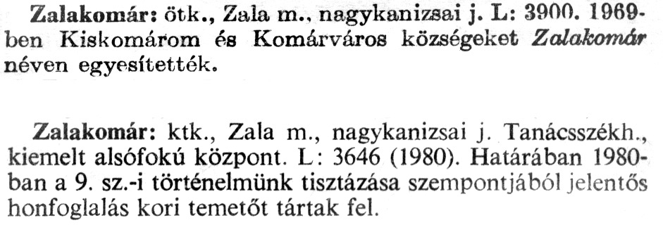 Nyilvános 1610 | 4819 | A szócikkek felismertetett szövege: | (A második szócikk az 1981-es kiadású kiegészítő kötetből származik) Zalakomár: ötk., Zala m., nagykanizsai j. L: 3900. 1969-ben Kiskomárom és Komárváros községeket Zalakomár néven egyesítették. Zalakomár: ktk., Zala m., nagykanizsai j. Tanácsszékh., kiemelt alsófokú központ. L: 3646 (1980). Határában 1980-ban a 9. sz.-i történelmünk tisztázása szempontjából jelentős honfoglalás kori temetőt tártak fel. A szócikkek a következő lexikonból származnak: Cím: Új magyar lexikon Közreműködő: Berei Andor (1900-1979) (szerk.) Szerz. közl.: [szerk. Berei Andor et al.] Kiadás jelzés: 2. lny. Kiadás: Budapest : Akad. K., 1961-1962 Kötetei: 1., A - C 2., D - F 3., G - J 4., K - Me 5., Mf - R 6., S - Z 7. köt., A-Z Kiegészítő kötet (1972) Kiegészítő kötet, 1962÷1980 (1981) ETO jelzet: 03=945.11 Szakjelzet: 030 Cutter: U 28 Nyelv: magyar Megjegyzés: Bibliogr. a címszavak egy részének végén |