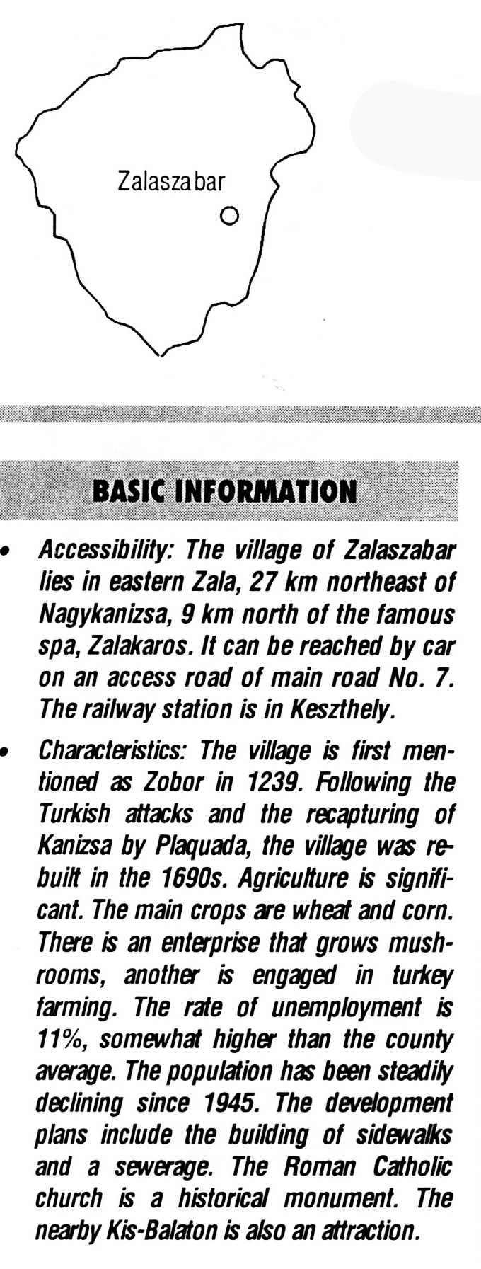 Nyilvános 2050 | 7232 | Rövid leírás | Teljes leírás (1.33 KB) | Zalaszabar BASIC INFORMATION Accessibility: The village of Zalaszabar lies in eastern Zala, 27 km northeast of Nagykanizsa, 9 km north of the famous spa, Zalakaros. It can be reached by car on an access road of main road No. 7. The railway station is in Keszthely. Characteristics: The village is first mentioned as Zobor in 1239. Following the Turkish attacks and the recapturing of Kanizsa by Plaquada, the village was rebuilt in the 1690s. Agriculture is significant. The main crops are wheat and corn. There is an enterprise that grows mushrooms, another is engaged in turkey farming. The rate of unemployment is 11%, somewhat higher than the county average. The population has been steadily declining since 1945. The development plans include the building of sidewalks and a sewerage. The Roman Catholic church is a historical monument. The nearby Kis-Balaton is also an attraction. This text came from the following book: Title: Handbook of Zala county (Zala megye kézikönyve) Series: County handbooks of Hungary (Magyarország megyei kézikönyvei) Chief editor: Hóbor József Publisher: (Hatvan), CEBA-Hungary Ltd, 1998 ETO: 908.439.121(035) ; 050.8(439.121) ISBN: 963-9089-18-2 Pages: 488-1040 p. Remark: Closed on: 1998. márc. 31. |