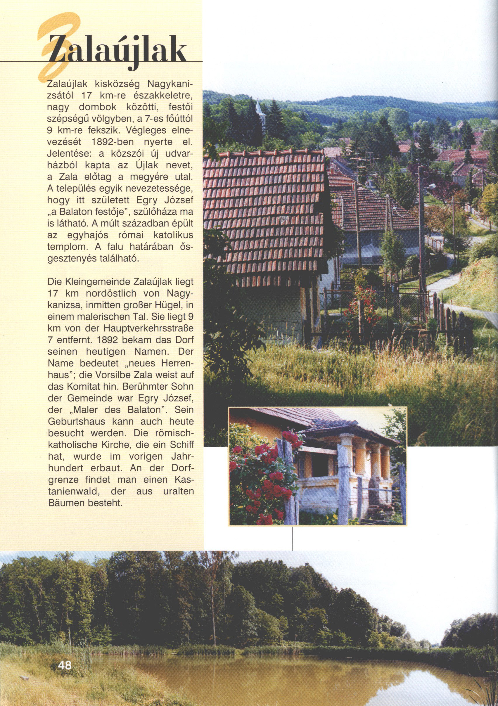 Nyilvános 1860 | 5364 | Zalaújlak | Die Kleingemeinde Zalaújlak liegt 17 km nordöstlich von Nagykanizsa, inmitten großer Hügel, in einem malerischen Tal. Sie liegt 9 km von der Hauptverkehrsstraße 7 entfernt. 1892 bekam das Dorf seinen heutigen Namen. Der Name bedeutet „neues Herrenhaus"; die Vorsilbe Zala weist auf das Komitat hin. Berühmter Sohn der Gemeinde war Egry József, der „Maler des Balaton". Sein Geburtshaus kann auch heute besucht werden. Die römischkatholische Kirche, die ein Schiff hat, wurde im vorigen Jahrhundert erbaut. An der Dorfgrenze findet man einen Kastanienwald, der aus uralten Bäumen besteht. Dieses Text stammt von: Titel: Hívogató a Régiók Kapujában - Útikönyv Látnivalók Nagykanizsán és Térségében (Einladend in dem Tor des Gebiets - Reisebuch - Sehenswürdigkeiten in Nagykanizsa und Umgebung) Herausgegeben von: Nagykanizsa és a Környező Települések Területfejlesztési Társulása (Verein für Gebietsentwicklung in Nagykanizsa und in ihrer Umgebung) 8800 Nagykanizsa, Petőfi Sándor út 5. Tel.: 06 93/536-453 • 06 93/536-454 Tel ./Fax: 06 93/326-323 E-mail: terstars@axelero.hu www.kanizsaterseg.celodin.hu |