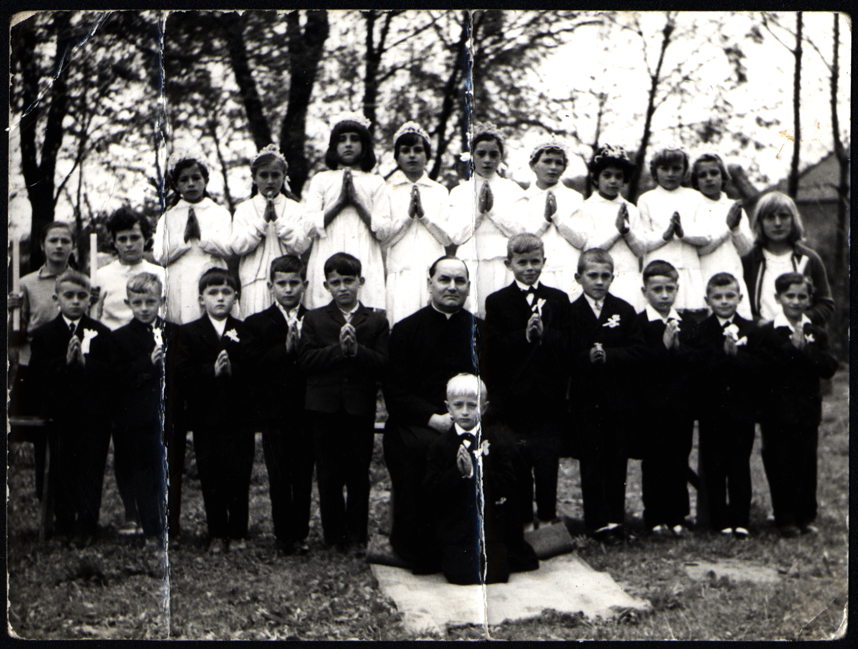 Nagyrécsei elsőáldozás, középen a plébános, Tenk József. 1960 körül