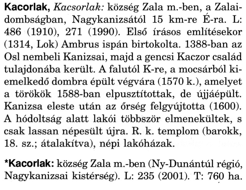 Nyilvános 2139 | 6051 | A szócikkek felismertetett szövege: | (A csillag után a kiegészítő kötetből származó szöveg következik) Kacorlak, Kacsorlak: község Zala m.-ben, a Zalaidombságban, Nagykanizsától 15 km-re É-ra. L: 486 (1910), 271 (1990). Első írásos említésekor (1314, Lok) Ambrus ispán birtokolta. 1388-ban az Osl nembeli Kanizsai, majd a gencsi Kaczor család tulajdonába került. A falutól K-re, a mocsárból kiemelkedő dombra épült végvára (1570 k.), amelyet a törökök 1588-ban elpusztítottak, de újjáépült. Kanizsa eleste után az őrség felgyújtotta (1600). A hódoltság alatt lakói többször elmenekültek, s csak lassan népesült újra. R. k. templom (barokk, 18. sz.; átalakítva), népi lakóházak. *Kacorlak: község Zala m.-ben (Ny-Dunántúl régió, Nagykanizsai kistérség). L: 235 (2001). T: 760 ha. A szócikkek a következő lexikonból származnak: Cím: Magyar nagylexikon Közreműködő: Élesztős László (1949) (szerk.) ; Barabás Éva (1943) (szerk.) ; Berényi Gábor (1946) (szerk.) ; Bárány Lászlóné (szerk.) ; Adelmann-né Kertész Judit (1945) (közrem.) ; Froemel Károlyné Jáky Éva (1936) (közrem.) ; Akadémiai Kiadó és Nyomda Vállala Szerz. közl.: [... Élesztős László főszerk.] ; [szerk. Barabás Éva et al.] ; [bibliogr. Adelmanné Kertész Judit] ; [kész. az Akadémiai Kiadó Magyar Nagylexikon Szerkesztőségében] Kiadás: Budapest : Akad. K., 1993- Kötetei: 1. köt., A - Anc 2. köt., And - Bag 3. köt., Bah - Bij 4. köt., Bik - Bz 5. köt., C - Csem 6. köt., Csen - Ec 7. köt., Ed - Fe 8. köt., Ff - Gyep 9. köt., Gyer - Iq 10. köt., Ir - Kip 11. köt., Kir - Lem 12. köt., Len - Mep 13. köt., Mer - Nyk 14. köt., Nyl - Pom 15. köt., Pon - Sek 16. köt., Sel - Szö 17. köt., Szp - Ung 18. köt., Unh - Z 19. köt., Kiegészítő kötet, A - Z ETO jelzet: 030=945.11 Szakjelzet: 030 Cutter: M 14 ISBN: 963-05-6611-7 [!ISBN 963-05-6615-X] Nyelv: magyar Megjegyzés: Az 5. kötettől kiad. a Magyar Nagylexikon Kiadó ; A 6. kötettől főszerk. Berényi Gábor ; A 6. kötettől szakszerk. Bárány Lászlóné et al. ; A 6. kötettől bibliogr. Froemel Károlyné ; Bibliogr. a szócikkek végén |