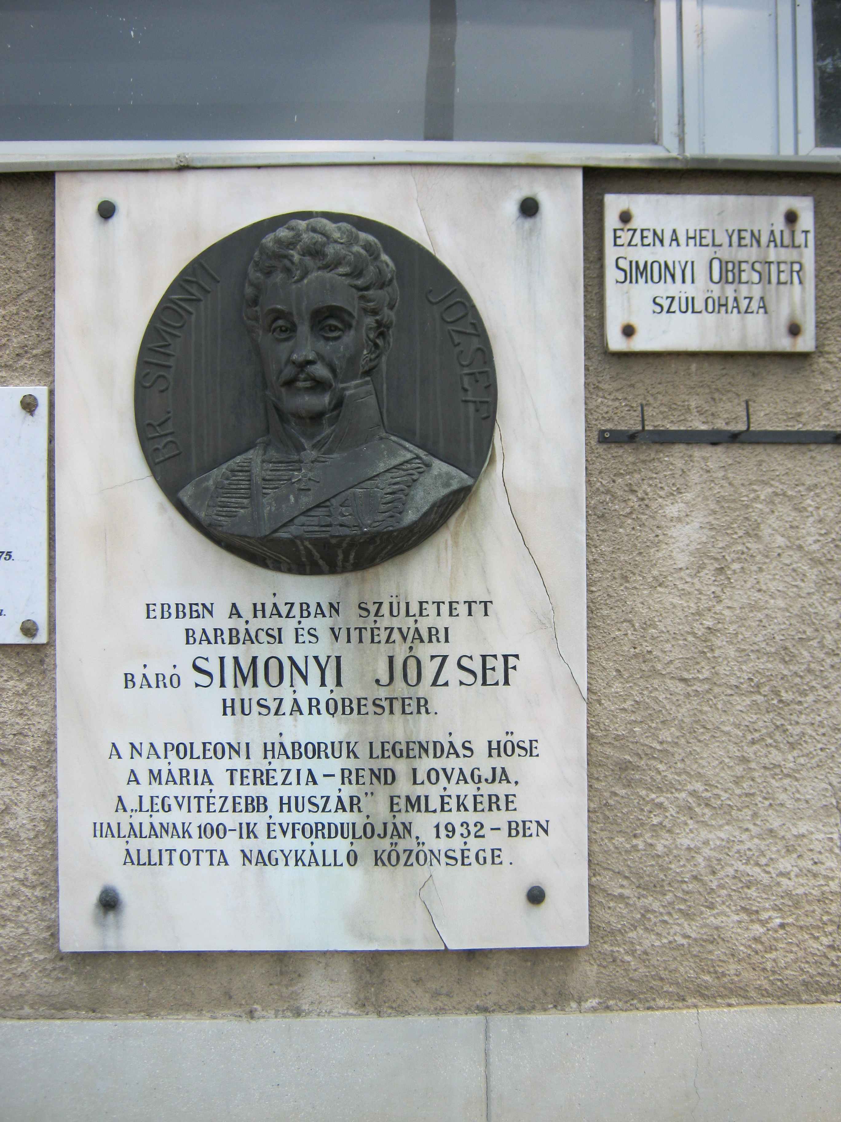 Nyilvános 1053 | 2403 | Nagykálló, Bátori út 2. | Egykor ezen a helyen állott a legendás Simonyi óbester szülőháza. Barbácsi és vitézvári báró Simonyi József (1771. március 18. – 1832. augusztus 23.), legendás hírű huszártiszt volt, kortársai "a legvitézebb huszár" kitüntető címmel illették. A panelházon szerencsére legalább látható az eredeti épületen 1932-ben elhelyezett emléktábla, egy új márványtáblán pedig megörökítették a szülőház képét. A fénykép 2010 augusztus elején készült. |