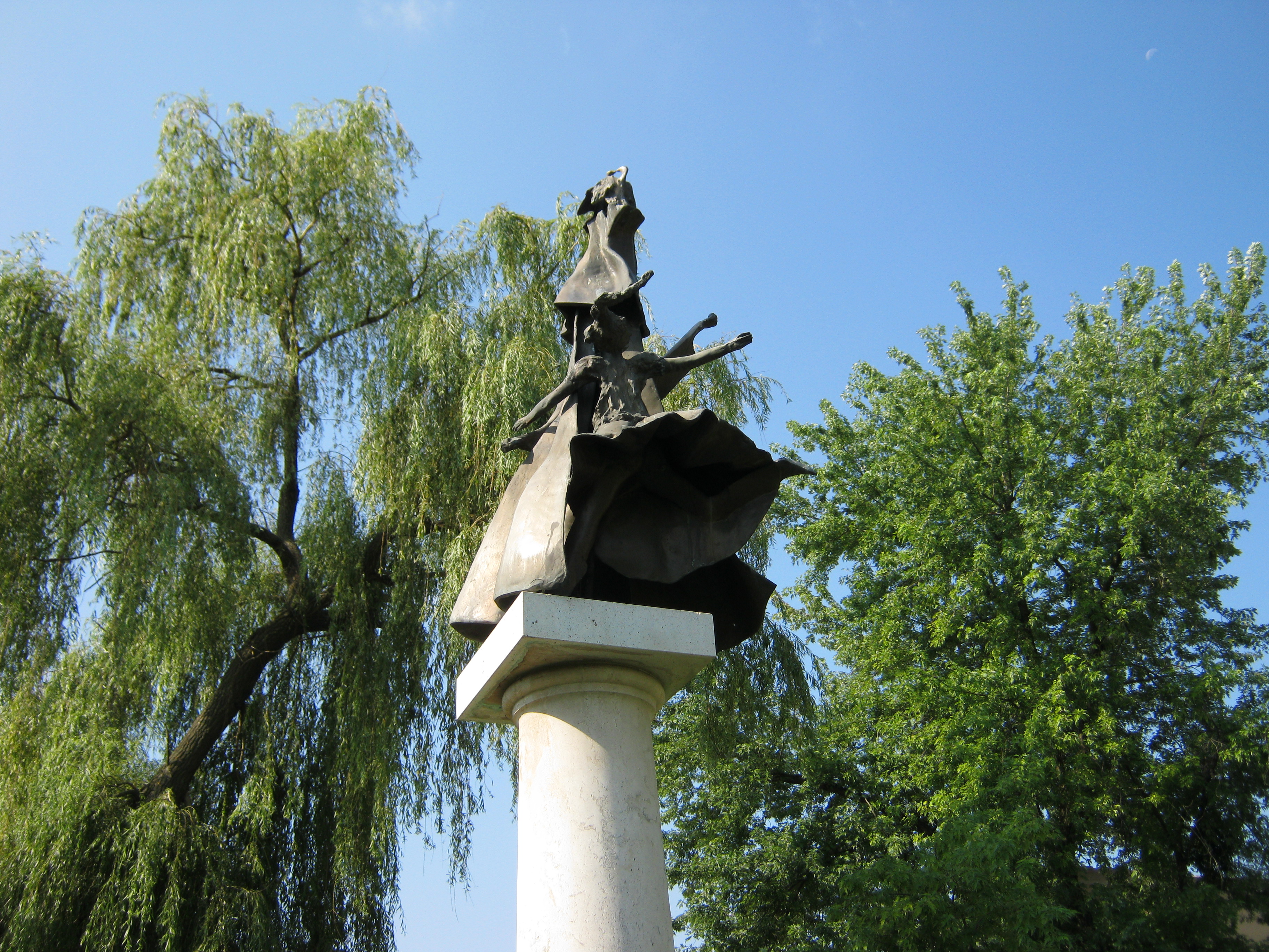 Nyilvános 767 | 1207 | Nagykálló, Szabadság tér: A "Kállai kettős" emlékmű | A művelődési ház előtt 1994-ben állították fel Borbás Tibor: Kállai kettős című szoborkompozícióját. A helyi dalos és táncos hagyományon alapuló ún. „kállai kettős”-t Kodály Zoltán tette világhírűvé, aki a helyszínen (lásd: Nagykálló, Nagybalkányi út 1.) 1926-ban megismert táncot 1950-ben öntötte műzenei formába a Magyar Állami Népi Együttes számára. A zeneszerző emléktábláját a művelődési ház belső terében helyezték el. A híres tánc hagyománya máig él a településen. Ébrentartói a Kállai Kettős Néptáncklub, a Kállai Lakodalmas Hagyományőrző Csoport és a Kiskállai Ifjúsági Néptáncegyüttes. A művelődési ház a házigazdája a kétévente ősszel megrendezésre kerülő Kállai Kettős Néptáncfesztiválnak. Felh. irod.: Harsányi Gézáné: Kálló kincsei. Nagykálló, 2007 www.nagykallo.net A fénykép 2010 augusztus elején készült. |