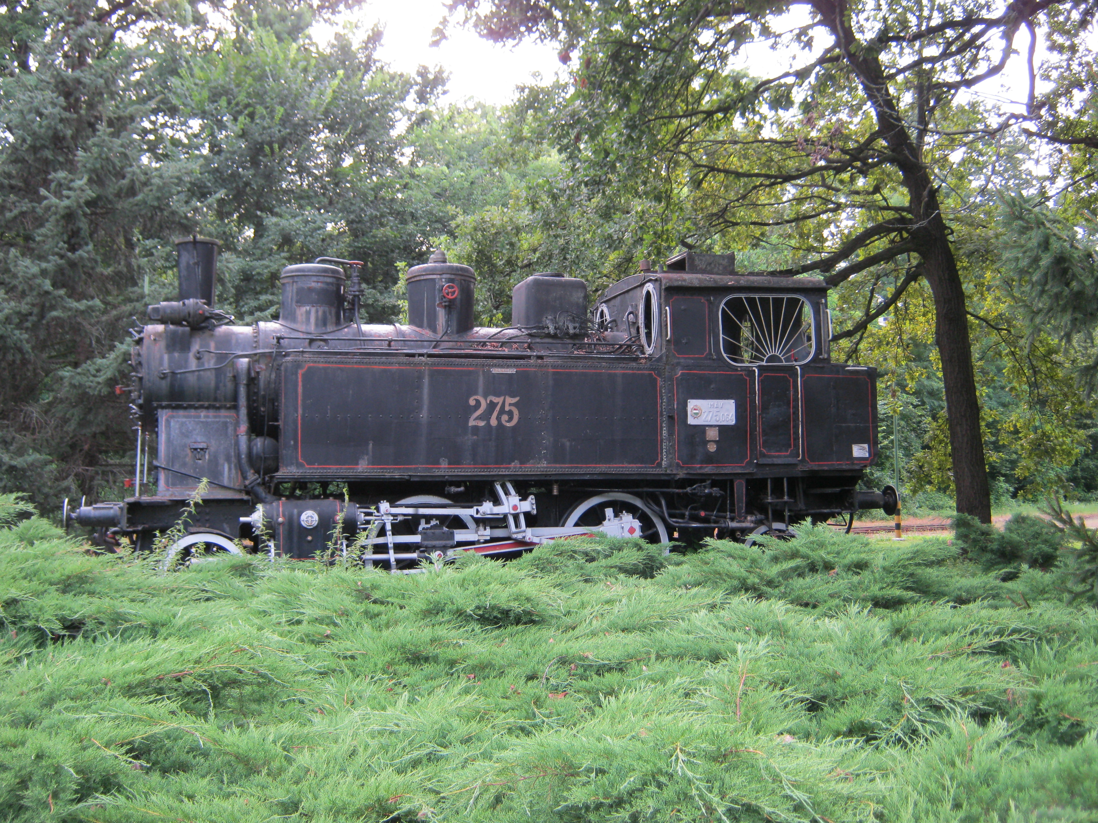 Nyilvános 814 | 3685 | Nyíregyháza-Sóstó, Vasútállomás | Sóstófürdő központjában ma étteremként üzemel a régi vasútállomás műemlékké nyilvánított épülete. 1911-ben ezt is Pazár István tervezte, eklektikus stílusban. Közelében a kisvasút egyik régi mozdonya is látható. A fénykép 2010 augusztus elején készült |