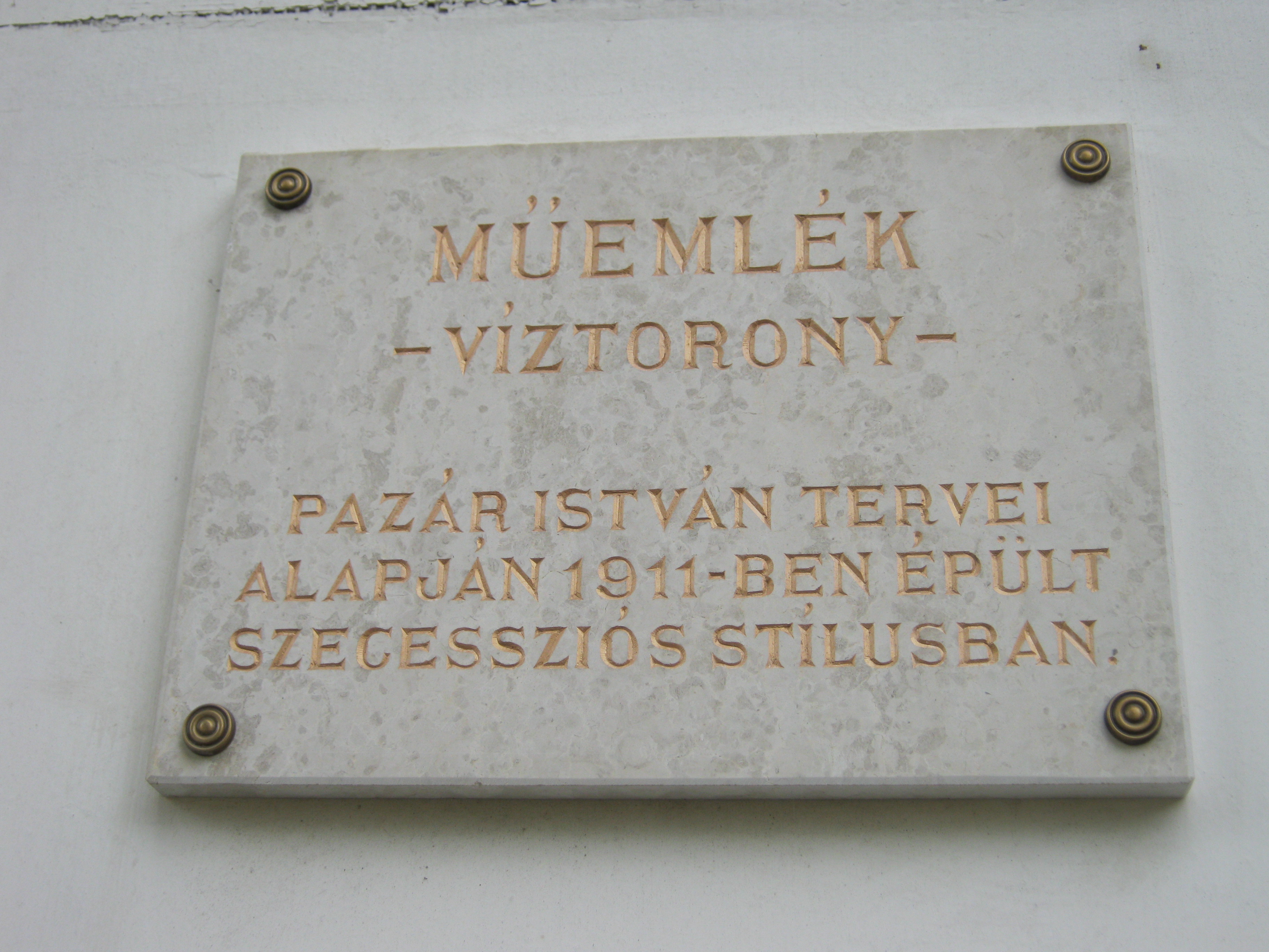 Nyilvános 763 | 1304 | Nyíregyháza-Sóstó, Víztorony | Sóstófürdő szimbóluma a szintén Pazár István által 1911-ben tervezett víztorony. A felfelé keskenyedő vörös téglaoszlopot kiszélesedő, nyolcszögletű toronyrész koronázza. A 60 köbméteres víztorony ma már nem működik, ipari műemlékké nyilvánították. Földszintjén idegenforgalmi iroda és pizzabár működik. Felh. irod.: Látnivalók Szabolcs-Szatmár-Bereg megyében. Miskolc, Well-PRess, 1990 A fénykép 2010 augusztus elején készült |