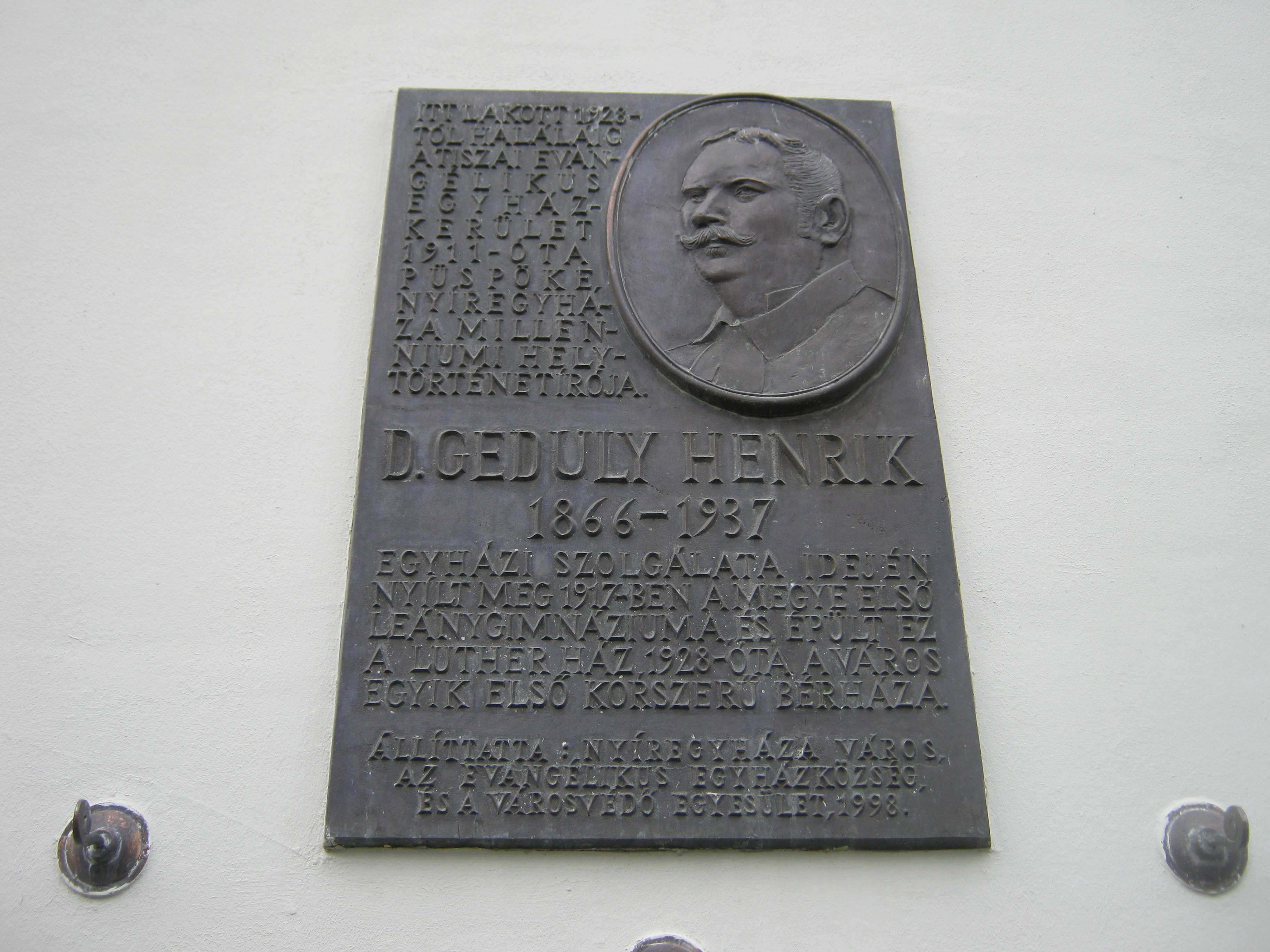 Nyilvános 791 | 1266 | Nyíregyháza, Luther utca 5. | Az épület egy másik táblája Geduly Henrik emlékét örökíti meg. A Tiszai Evangélikus Egyházkerület püspöke itt lakott, az általa 1928-ban építtetett házban. Ez volt Nyíregyháza első korszerű bérháza. Geduly egyházi működése mellett 1896-ban megírta a "Nyíregyháza az ezredik évben" című városmonográfiát. Ő alapította a leánygimnáziumot és tevékenyen részt vett a város kulturális és társadalmi életében. Sírja az Északi temetőben (lásd: Pazonyi tér 5.) található. Felh. irod.: http://www.lutheran.hu/z/ujsagok/evelet/archivum/2007/07/103 A fénykép 2010 augusztus elején készült. |