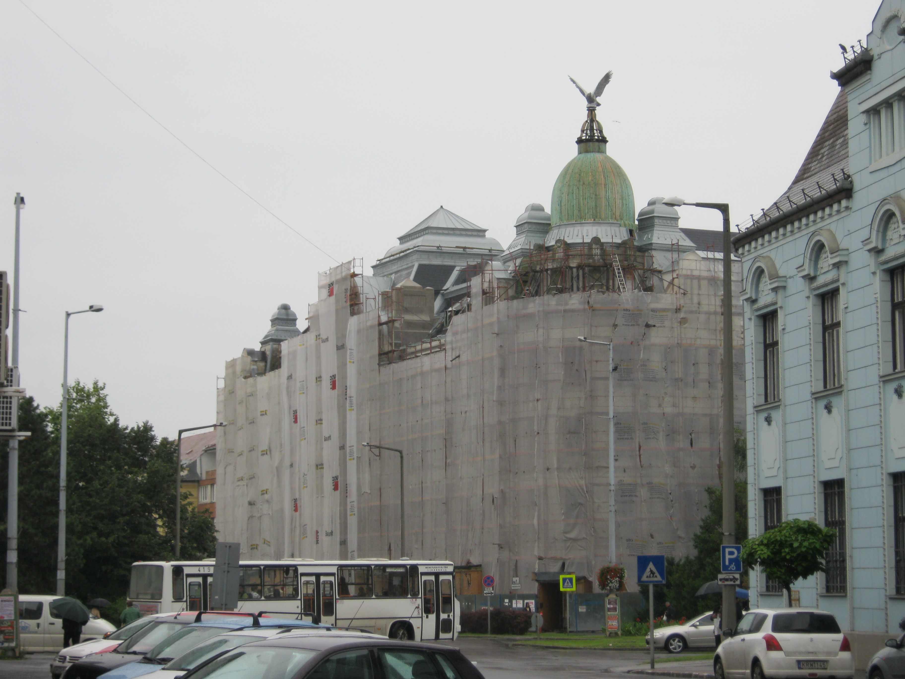 Nyilvános 788 | 1243 | Nyíregyháza, Széchenyi utca 1. Nyírvíz-palota | Az Országzászló tér nyugati oldalán indul a város egykori főútvonala, a Széchenyi utca. Itt van a bejárata a hatalmas tömböt elfoglaló Nyírvíz-palotának, amely 1913-ban épült a Nyírvíz-szabályozó Társulat székházának Papp Gyula és Szabolcs Ferenc tervei alapján. A városban mind építészetileg, mind városképileg meghatározó épület szecessziós és eklektikus jegyeket visel magán. A lépcsőház díszes ablakai (87 négyzetméter), a lift és a függőfolyosó lengő ajtajainak maratott üvegei (43 négyzetméter), valamint a homlokzat gyönyörű díszei Róth Miksa műhelyében (lásd: Budapest, 07. Nefelejcs u. 26.) készültek. Eredetileg a földszinten üzletek, szolgálati lakások, az emeleteken bérlakások, hivatal helyiségek nyertek elhelyzést. Személy- és teherfelvonóval, házi vízvezetékrendszerrel és központi fűtéssel rendelkezett. Két kapubejárata lett a Széchenyi utca és az Országzászló tér felől nyílik, amelyek ikerlépcsőházban találkoznak. Kupoláján rétisas látható, amely az eltűnt eredeti másolata. (Ottjártamkor felállványozva találtam, de mivel fontos épület, ebben az állapotában is lefényképeztem. KK.) Felh. irod.: www.nyirviz.hu A fénykép 2010 augusztus elején készült |