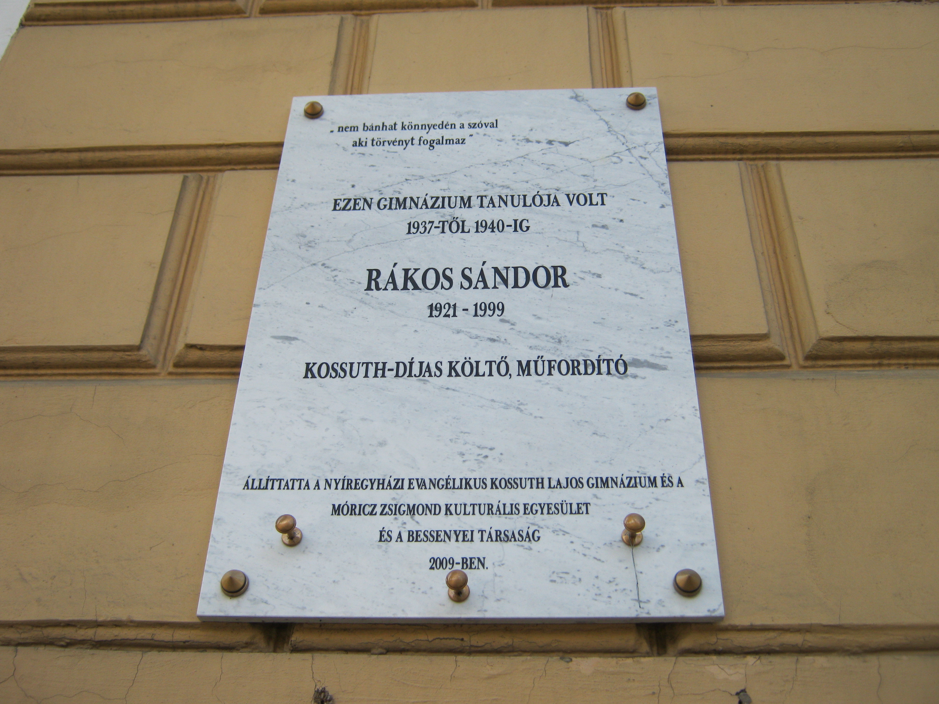 Nyilvános 768 | 1149 | Nyíregyháza, Szent István utca 19. Evangélikus Kossuth Lajos Gimnázium | A megye legrégibb középiskolája. 1808-ban alapították mint evangélikus professzori iskolát (lásd: Nyíregyháza, Luther utca 5.). Nyolc osztályos gimnáziummá 1888-ra fejlesztették fel. Mai épületét ekkoriban, 1887-ben emelték Bobula János tervei szerint. Kossuth Lajos nevét 1921-ben vette fel. Az 1948-ban államosított iskolát 1992-ben kapta vissza az evangélikus egyház. Homlokzatán számos márványtábla emlékezik kiváló diákjaira, tanáraira. Krúdy emléktáblája mellett Rákos Sándor költőé látható. A közelben született (lásd: Kálmánháza, Kossuth utca 53.) Kossuth-díjas költő, műfordító 1937 és 1940 között volt a gimnázium tanulója. Felh. irod.: www.eklg.hu A fénykép 2010 augusztus elején készült |