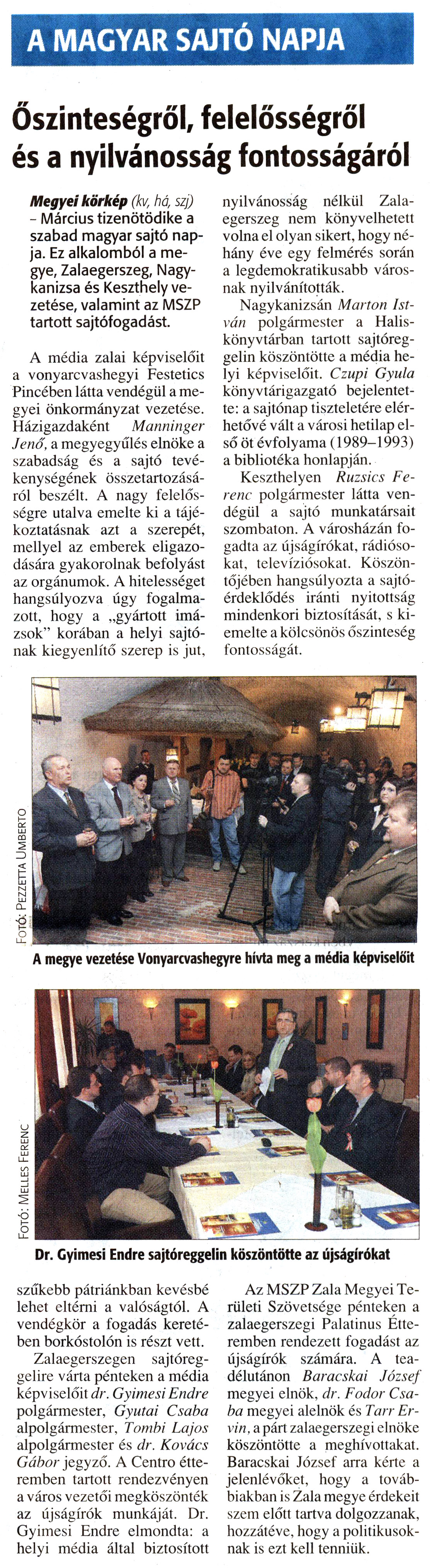 Nyilvános 1044 | 2443 | Zalai Hírlap 2008. március 17. 64. szám 4. oldal - A Magyar Sajtó Napja | A cikkben említett "városi hetilap első öt évfolyama (1989-1993)" a Kanizsa - Dél-Zalai Hetilap első öt évfolyamát jelenti. Elérhető a következő link mögött: http://www.nagykar.hu/ekonyvek/451.html Ugyanitt válik elérhetővé a lap minden további digitalizált példánya. Az eseményről, melyről a Zalai Hírlap tudósít, további képek találhatók a következő link mögött: http://www.nagykar.hu/keptar/2907.html A MAGYAR SAJTÓ NAPJA Őszinteségről, felelősségről és a nyilvánosság fontosságáról Megyei körkép (kvr há, szj) - Március tizenötödike a szabad magyar sajtó napja. Ez alkalomból a megye, Zalaegerszeg, Nagykanizsa és Keszthely vezetése, valamint az MSZP tartott sajtófogadást. A média zalai képviselőit a vonyarcvashegyi Festetics Pincében látta vendégül a megyei önkormányzat vezetése. Házigazdaként Manninger Jenő, a megyegyűlés elnöke a szabadság és a sajtó tevékenységének összetartozásáról beszélt. A nagy felelősségre utalva emelte ki a tájékoztatásnak azt a szerepét, mellyel az emberek eligazodására gyakorolnak befolyást az orgánumok. A hitelességet hangsúlyozva úgy fogalmazott, hogy a „gyártott imázsok" korában a helyi sajtónak kiegyenlítő szerep is jut, szűkebb pátriánkban kevésbé lehet eltérni a valóságtól. A vendégkör a fogadás keretében borkóstolón is részt vett. Zalaegerszegen sajtóreggelire várta pénteken a média képviselőit dr. Gyimesi Endre polgármester, Gyutai Csaba alpolgármester, Tombi Lajos alpolgármester és dr. Kovács Gábor jegyző. A Centro étteremben tartott rendezvényen a város vezetői megköszönték az újságírók munkáját. Dr. Gyimesi Endre elmondta: a helyi média által biztosított nyilvánosság nélkül Zalaegerszeg nem könyvelhetett volna el olyan sikert, hogy néhány éve egy felmérés során a legdemokratikusabb városnak nyilvánították. Nagykanizsán Marton István polgármester a Halis-könyvtárban tartott sajtóreggelin köszöntötte a média helyi képviselőit. Czupi Gyula könyvtárigazgató bejelentette: a sajtónap tiszteletére elérhetővé vált a városi hetilap első öt évfolyama (1989-1993) a bibliotéka honlapján. Keszthelyen Ruzsics Ferenc polgármester látta vendégül a sajtó munkatársait szombaton. A városházán fogadta az újságírókat, rádiósokat, televíziósokat. Köszöntőjében hangsúlyozta a sajtóérdeklődés iránti nyitottság mindenkori biztosítását, s kiemelte a kölcsönös őszinteség fontosságát. Az MSZP Zala Megyei Területi Szövetsége pénteken a zalaegerszegi Palatínus Étteremben rendezett fogadást az újságírók számára. A teadélutánon Baracskai József megyei elnök, dr. Fodor Csaba megyei alelnök és Tarr Er-vin, a párt zalaegerszegi elnöke köszöntötte a meghívottakat. Baracskai József arra kérte a jelenlévőket, hogy a továbbiakban is Zala megye érdekeit szem előtt tartva dolgozzanak, hozzátéve, hogy a politikusoknak is ezt kell tenniük. |