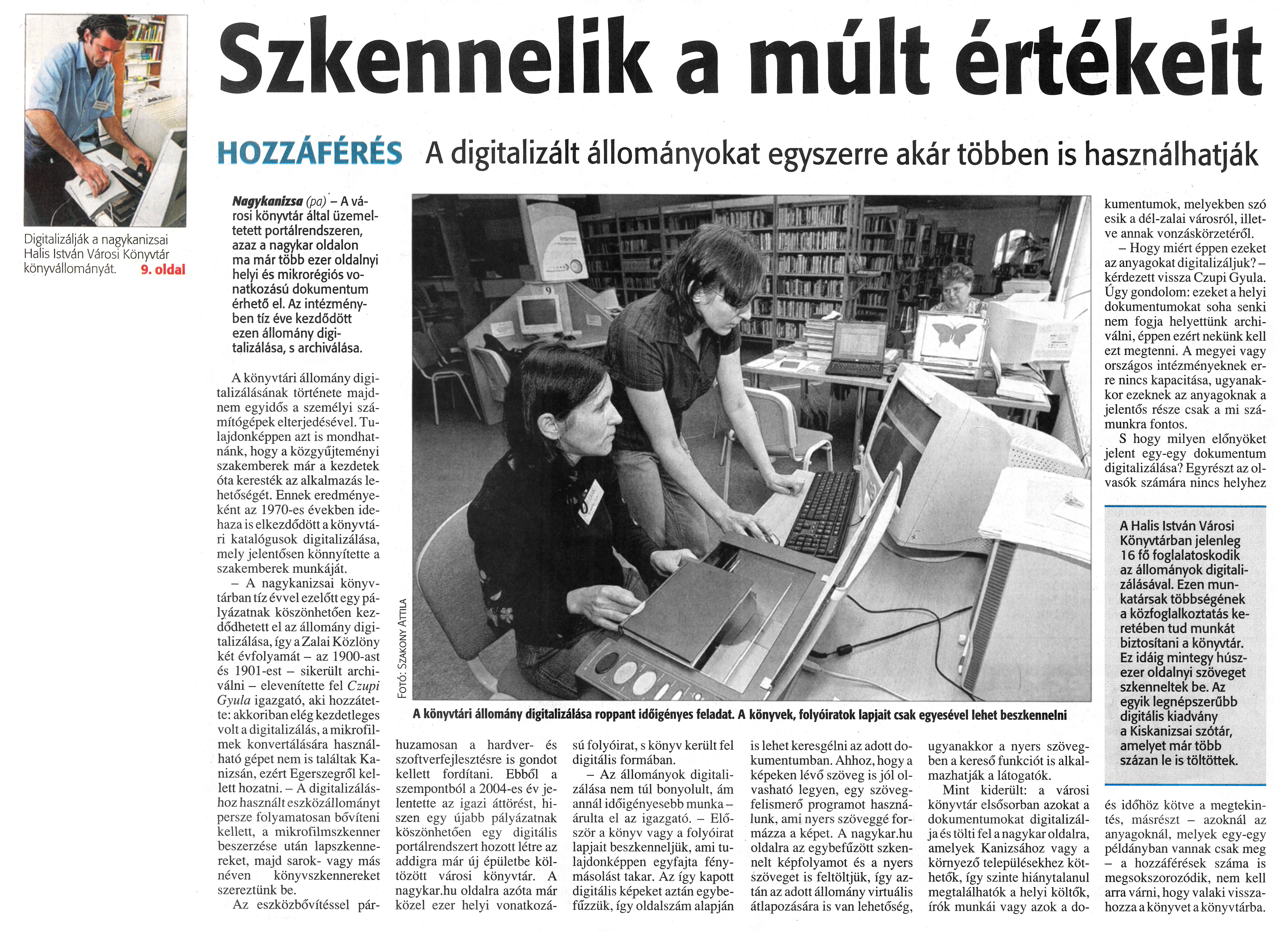 Nyilvános 922 | 1316 | Zalai Hírlap 2009.10.08. 236. szám 9. oldal - Szkennelik a múlt értékeit | A cikk szövege: Digitalizálják a nagykanizsai Halis István Városi Könyvtár könyvállományát. 9. oldal Szkennelik a múlt értékeit A könyvtári állomány digitalizálása roppant időigényes feladat. A könyvek, folyóiratok lapjait csak egyesével lehet beszkennelni HOZZÁFÉRÉS A digitalizált állományokat egyszerre akar többen is használhatják Nagykanizsa (pa) - A városi könyvtár által üzemeltetett portálrendszeren, azaz a nagykar oldalon ma már több ezer oldalnyi helyi és mikrorégiós vonatkozású dokumentum érhető el. Az intézményben tíz éve kezdődött ezen állomány digitalizálása, s archiválása. A könyvtári állomány digitalizálásának története majdnem egyidős a személyi számítógépek elterjedésével. Tulajdonképpen azt is mondhatnánk, hogy a közgyűjteményi szakemberek már a kezdetek óta keresték az alkalmazás lehetőségét. Ennek eredményeként az 1970-es években idehaza is elkezdődött a könyvtári katalógusok digitalizálása, mely jelentősen könnyítette a szakemberek munkáját. - A nagykanizsai könyvtárban tíz évvel ezelőtt egy pályázatnak köszönhetően kezdődhetett el az állomány digitalizálása, így a Zalai Közlöny két évfolyamát - az 1900-ast és 190l-est - sikerült archiválni - elevenítette fel Czupi Gyula igazgató, aki hozzátette: akkoriban elég kezdetleges volt a digitalizálás, a mikrofilmek konvertálására használható gépet nem is találtak Kanizsán, ezért Egerszegről kellett hozatni. - A digitalizáláshoz használt eszközállományt persze folyamatosan bővíteni kellett, a mikrofilmszkenner beszerzése után lapszkennereket, majd sarok- vagy más néven könyvszkennereket szereztünk be. Az eszközbővítéssel párhuzamosan a hardver- és szoftverfejlesztésre is gondot kellett fordítani. Ebből a szempontból a 2004-es év jelentette az igazi áttörést, hiszen egy újabb pályázatnak köszönhetően egy digitális portálrendszert hozott létre az addigra már új épületbe költözött városi könyvtár. A nagykar.hu oldalra azóta már közel ezer helyi vonatkozású folyóirat, s könyv került fel digitális formában. - Az állományok digitalizálása nem túl bonyolult, ám annál időigényesebb munka -árulta el az igazgató. - Először a könyv vagy a folyóirat lapjait beszkenneljük, ami tulajdonképpen egyfajta fénymásolást takar. Az így kapott digitális képeket aztán egybefűzzük, így oldalszám alapján is lehet keresgélni az adott dokumentumban. Ahhoz, hogy a képeken lévő szöveg is jól olvasható legyen, egy szövegfelismerő programot használunk, ami nyers szöveggé formázza a képet. A nagykar.hu oldalra az egybefűzött szkennert képfolyamot és a nyers szöveget is feltöltjük, így aztán az adott állomány virtuális átlapozására is van lehetőség, ugyanakkor a nyers szövegben a kereső funkciót is alkalmazhatják a látogatók. Mint kiderült: a városi könyvtár elsősorban azokat a dokumentumokat digitalizálja és tölti fel a nagykar oldalra, amelyek Kanizsához vagy a környező településekhez köthetők, így szinte hiánytalanul megtalálhatók a helyi költők, írók munkái vagy azok a dokumentumok, melyekben szó esik a dél-zalai városról, illetve annak vonzáskörzetéről. - Hogy miért éppen ezeket az anyagokat digitalizáljuk? -kérdezett vissza Czupi Gyula. Úgy gondolom: ezeket a helyi dokumentumokat soha senki nem fogja helyettünk archiválni, éppen ezért nekünk kell ezt megtenni. A megyei vagy országos intézményeknek erre nincs kapacitása, ugyanakkor ezeknek az anyagoknak a jelentős része csak a mi számunkra fontos. S hogy milyen előnyöket jelent egy-egy dokumentum digitalizálása? Egyrészt az olvasók számára nincs helyhez A Halis István Városi Könyvtárban jelenleg 16 fő foglalatoskodik az állományok digitalizálásával. Ezen munkatársak többségének a közfoglalkoztatás keretében tud munkát biztosítani a könyvtár. Ez idáig mintegy húszezer oldalnyi szöveget szkenneltek be. Az egyik legnépszerűbb digitális kiadvány a Kiskanizsai szótár, amelyet már több százan le is töltöttek. és időhöz kötve a megtekintés, másrészt - azoknál az anyagoknál, melyek egy-egy példányban vannak csak meg - a hozzáférések száma is megsokszorozódik, nem kell arra várni, hogy valaki visszahozza a könyvet a könyvtárba. |