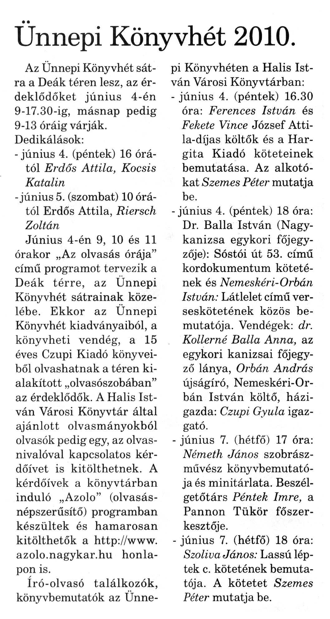 Nyilvános 954 | 1389 | Nagykanizsai Maraton 2010. június 4. 022. szám 2. oldal - Ünnepi Könyvhét 2010 | A cikk szövege: Ünnepi Könyvhét 2010. Az Ünnepi Könyvhét sátra a Deák téren lesz, az érdeklődőket június 4-én 9-17.30-ig, másnap pedig 9-13 óráig várják. Dedikálások: - június 4. (péntek) 16 órától Erdős Attila, Kocsis Katalin -június 5. (szombat) 10 órától Erdős Attila, Riersch Zoltán Június 4-én 9, 10 és 11 órakor „Az olvasás órája" című programot tervezik a Deák térre, az Ünnepi Könyvhét sátrainak közelébe. Ekkor az Ünnepi Könyvhét kiadványaiból, a könyvheti vendég, a 15 éves Czupi Kiadó könyveiből olvashatnak a téren kialakított „olvasószobában" az érdeklődők. A Halis István Városi Könyvtár által ajánlott olvasmányokból olvasók pedig egy, az olvasnivalóval kapcsolatos kérdőívet is kitölthetnek. A kérdőívek a könyvtárban induló „Azolo" (olvasásnépszerűsítő) programban készültek és hamarosan kitölthetők a http://www. azolo.nagykar.hu honlapon is. író-olvasó találkozók, könyvbemutatók az Ünne- pi Könyvhéten a Halis István Városi Könyvtárban: - június 4. (péntek) 16.30 óra: Ferences István és Fekete Vince József Attila-díjas költők és a Hargita Kiadó köteteinek bemutatása. Az alkotókat Szemes Péter mutatja be. - június 4. (péntek) 18 óra: Dr. Balla István (Nagykanizsa egykori főjegyzője): Sóstói út 53. című kordokumentum kötetének és Nemeskéri-Orbán István: Látlelet című verseskötetének közös bemutatója. Vendégek: dr. Kollerné Balla Anna, az egykori kanizsai főjegyző lánya, Orbán András újságíró, Nemeskéri-Orbán István költő, házigazda: Czupi Gyula igazgató. - június 7. (hétfő) 17 óra: Németh János szobrászművész könyvbemutatója és minitárlata. Beszélgetőtárs Péntek Imre, a Pannon Tükör főszerkesztője. - június 7. (hétfő) 18 óra: Szoliva János: Lassú léptek c. kötetének bemutatója. A kötetet Szemes Péter mutatja be. |