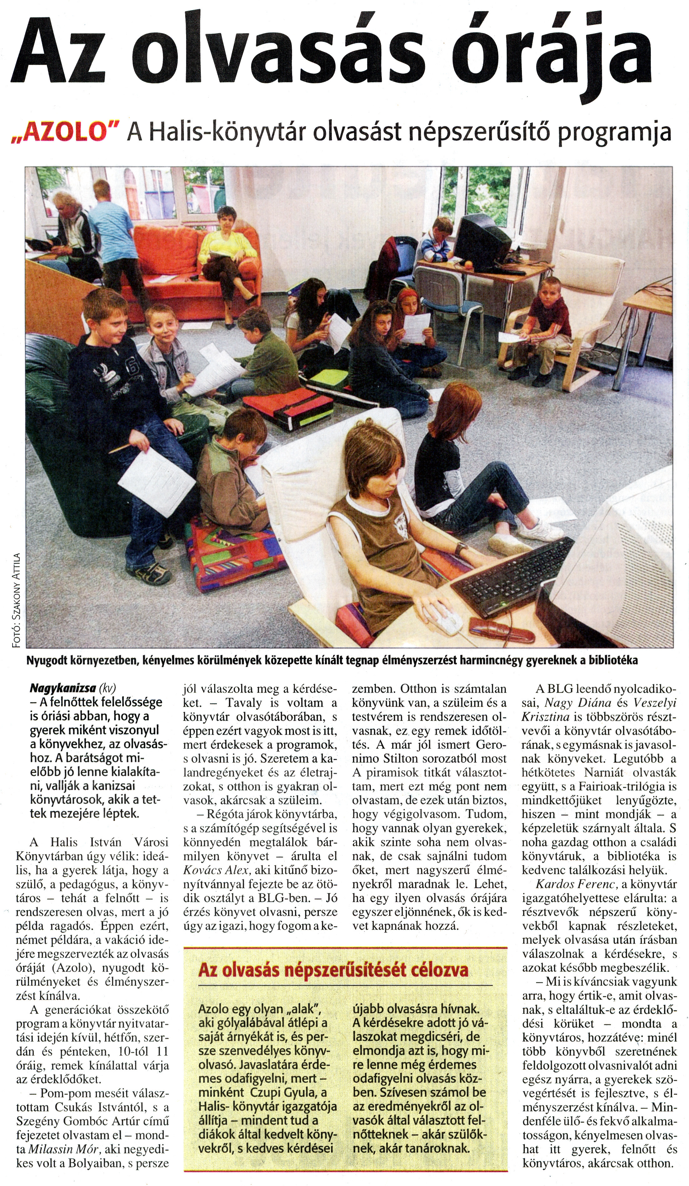 Nyilvános 1150 | 1860 | Zalai Hírlap 2010. június 22. 143. szám 11. oldal - Az olvasás órája | A cikk szövege: Az olvasás órája „AZOLO" A Halis-könyvtár olvasást népszerűsítő programja Nyugodt környezetben, kényelmes körülmények közepette kínált tegnap élményszerzést harmincnégy gyereknek a bibliotéka Nagykanizsa (kv) - A felnőttek felelőssége is óriási abban, hogy a gyerek miként viszonyul a könyvekhez, az olvasáshoz. A barátságot mielőbb jó lenne kialakítani, vallják a kanizsai könyvtárosok, akik a tettek mezejére léptek. A Halis István Városi Könyvtárban úgy vélik: ideális, ha a gyerek látja, hogy a szülő, a pedagógus, a könyvtáros - tehát a felnőtt - is rendszeresen olvas, mert a jó példa ragadós. Éppen ezért, német példára, a vakáció idejére megszervezték az olvasás óráját (Azolo), nyugodt körülményeket és élményszerzést kínálva. A generációkat összekötő program a könyvtár nyitvatartási idején kívül, hétfőn, szerdán és pénteken, 10-tól 11 óráig, remek kínálattal várja az érdeklődőket. - Pom-pom meséit választottam Csukás Istvántól, s a Szegény Gombóc Artúr című fejezetet olvastam el - mondta Milassin Mór, aki negyedikes volt a Bolyaiban, s persze jól válaszolta meg a kérdéseket. - Tavaly is voltam a könyvtár olvasótáborában, s éppen ezért vagyok most is itt, mert érdekesek a programok, s olvasni is jó. Szeretem a kalandregényeket és az életrajzokat, s otthon is gyakran olvasok, akárcsak a szüleim. - Régóta járok könyvtárba, s a számítógép segítségével is könnyedén megtalálok bármilyen könyvet - árulta el Kovács Alex, aki kitűnő bizonyítvánnyal fejezte be az ötödik osztályt a BLG-ben. - Jó érzés könyvet olvasni, persze úgy az igazi, hogy fogom a kezemben. Otthon is számtalan könyvünk van, a szüleim és a testvérem is rendszeresen olvasnak, ez egy remek időtöltés. A már jól ismert Geronimo Stilton sorozatból most A piramisok titkát választottam, mert ezt még pont nem olvastam, de ezek után biztos, hogy végigolvasom. Tudom, hogy vannak olyan gyerekek, akik szinte soha nem olvasnak, de csak sajnálni tudom őket, mert nagyszerű élményekről maradnak le. Lehet, ha egy ilyen olvasás órájára egyszer eljönnének, ők is kedvet kapnának hozzá. A BLG leendő nyolcadikosai, Nagy Diána és Veszelyi Krisztina is többszörös résztvevői a könyvtár olvasótáborának, s egymásnak is javasolnak könyveket. Legutóbb a hétkötetes Narniát olvasták együtt, s a Fairioak-trilógia is mindkettőjüket lenyűgözte, hiszen - mint mondják - a képzeletük szárnyalt általa. S noha gazdag otthon a családi könyvtáruk, a bibliotéka is kedvenc találkozási helyük. Kardos Ferenc, a könyvtár igazgatóhelyettese elárulta: a résztvevők népszerű könyvekből kapnak részleteket, melyek olvasása után írásban válaszolnak a kérdésekre, s azokat később megbeszélik. - Mi is kíváncsiak vagyunk arra, hogy értik-e, amit olvasnak, s eltaláltuk-e az érdeklődési körüket - mondta a könyvtáros, hozzátéve: minél több könyvből szeretnének feldolgozott olvasnivalót adni egész nyárra, a gyerekek szövegértését is fejlesztve, s élményszerzést kínálva. - Mindenféle ülő- és fekvő alkalmatosságon, kényelmesen olvashat itt gyerek, felnőtt és könyvtáros, akárcsak otthon. Az olvasás népszerűsítését célozva Azolo egy olyan „alak", aki gólyalábával átlépi a saját árnyékát is, és persze szenvedélyes könyvolvasó. Javaslatára érdemes odafigyelni, mert -minként Czupi Gyula, a Halis- könyvtár igazgatója állítja - mindent tud a diákok által kedvelt könyvekről, s kedves kérdései újabb olvasásra hívnak. A kérdésekre adott jó válaszokat megdicséri, de elmondja azt is, hogy mire lenne még érdemes odafigyelni olvasás közben. Szívesen számol be az eredményekről az olvasók által választott felnőtteknek - akár szülőknek, akár tanároknak. |