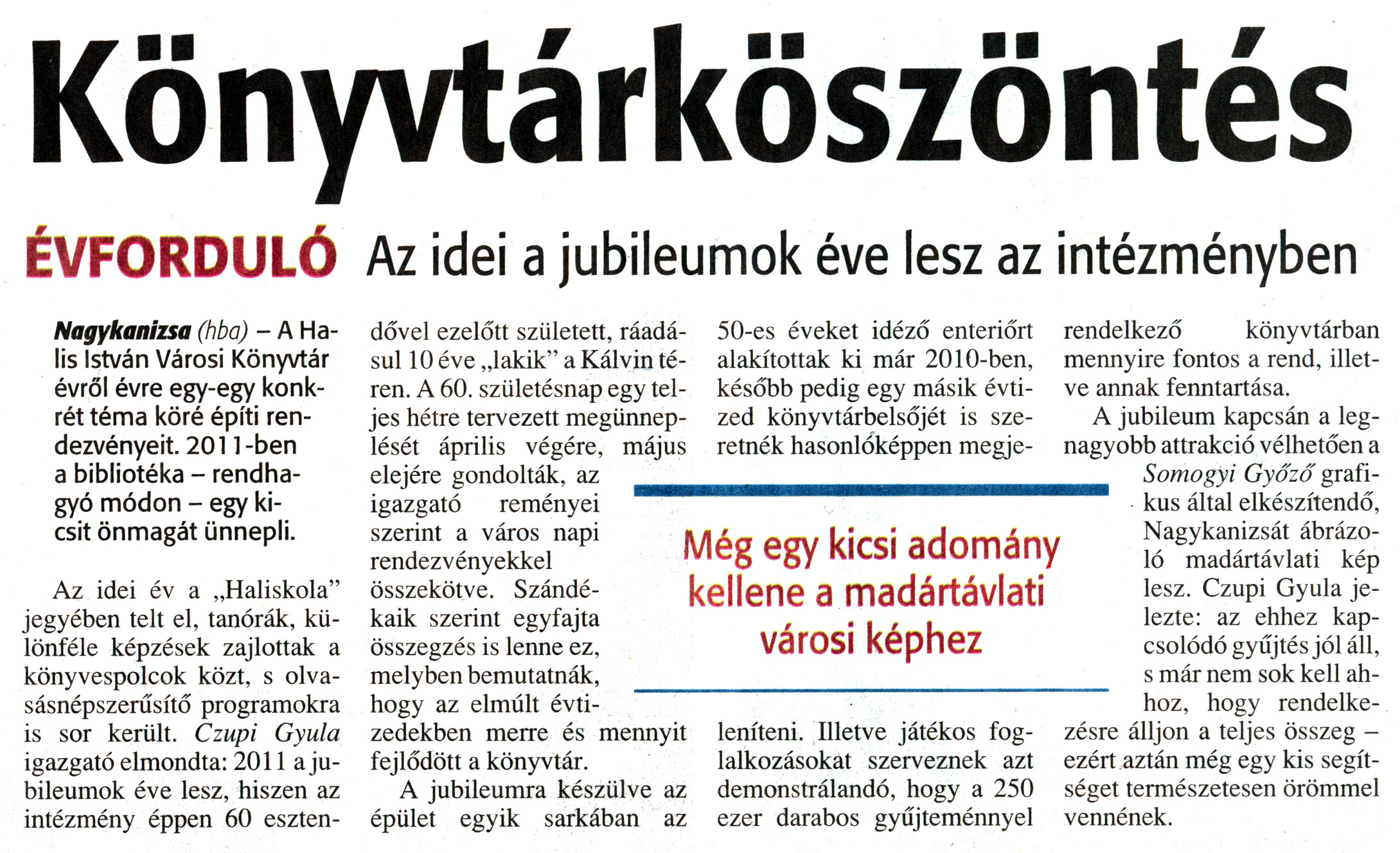 Nyilvános 1631 | 5361 | Zalai Hírlap 2011. január 3. 1. szám 7. oldal - Könyvtárköszöntés | A cikk szövege: Könyvtárköszöntés ÉVFORDULÓ Az idei a jubileumok éve lesz az intézményben Még egy kicsi adomány kellene a madártávlati városi képhez Nagykanizsa (hba) - A Halis István Városi Könyvtár évről évre egy-egy konkrét téma köré építi rendezvényeit. 2011-ben a bibliotéka - rendhagyó módon - egy kicsit önmagát ünnepli. Az idei év a „Haliskola" jegyében telt el, tanórák, különféle képzések zajlottak a könyvespolcok közt, s olvasásnépszerűsítő programokra is sor került. Czupi Gyula igazgató elmondta: 2011 a jubileumok éve lesz, hiszen az intézmény éppen 60 esztendővel ezelőtt született, ráadásul 10 éve „lakik" a Kálvin téren. A 60. születésnap egy teljes hétre tervezett megünneplését április végére, május elejére gondolták, az igazgató reményei szerint a város napi rendezvényekkel összekötve. Szándékaik szerint egyfajta összegzés is lenne ez, melyben bemutatnák, hogy az elmúlt évtizedekben merre és mennyit fejlődött a könyvtár. A jubileumra készülve az épület egyik sarkában az 50-es éveket idéző enteriőrt alakítottak ki már 2010-ben, később pedig egy másik évtized könyvtárbelsőjét is szeretnék hasonlóképpen megjeleníteni. Illetve játékos foglalkozásokat szerveznek azt demonstrálandó, hogy a 250 ezer darabos gyűjteménnyel rendelkező könyvtárban mennyire fontos a rend, illetve annak fenntartása. A jubileum kapcsán a legnagyobb attrakció vélhetően a Somogyi Győző grafikus által elkészítendő, Nagykanizsát ábrázoló madártávlati kép lesz. Czupi Gyula jelezte: az ehhez kapcsolódó gyűjtés jól áll, s már nem sok kell ahhoz, hogy rendelkezésre álljon a teljes összeg - ezért aztán még egy kis segítséget természetesen örömmel vennének. |
