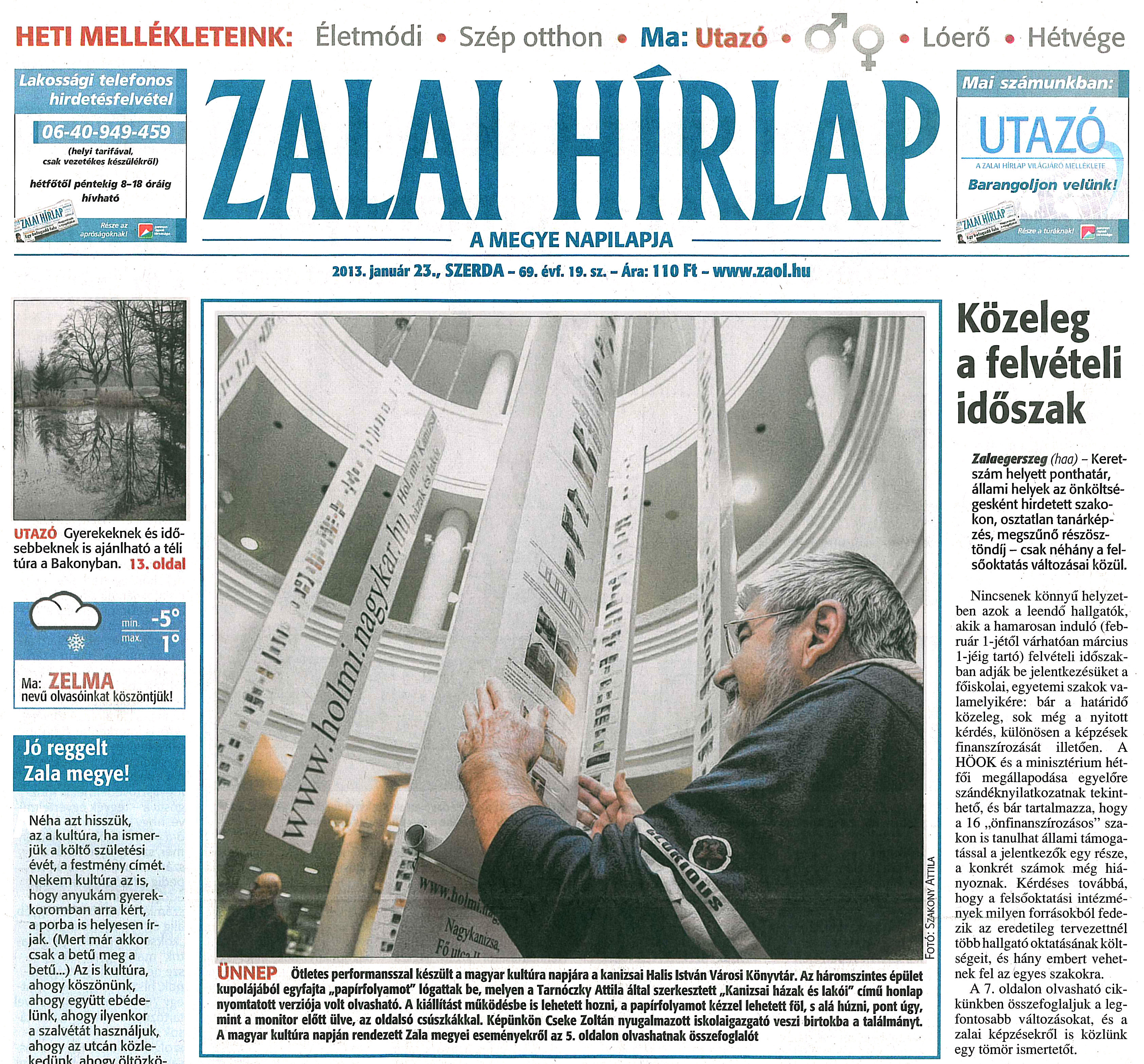 Nyilvános 1518 | 4982 | Zalai Hírlap 2013. január 23. 19. szám 1. oldal - Ünnep | ÜNNEP Ötletes performansszal készült a magyar kultúra napjára a kanizsai Halis István Városi Könyvtár. Az háromszintes épület kupolájából egyfajta „papírfolyamot" lógattak be, melyen a Tarnóczky Attila által szerkesztett „Kanizsai házak és lakói" című honlap nyomtatott verziója volt olvasható. A kiállítást működésbe is lehetett hozni, a papírfolyamot kézzel lehetett föl, s alá húzni, pont úgy, mint a monitor előtt ülve, az oldalsó csúszkákkal. Képünkön Cseke Zoltán nyugalmazott iskolaigazgató veszi birtokba a találmányt. A magyar kultúra napján rendezett Zala megyei eseményekről az 5. oldalon olvashatnak összefoglalót Fotó: Szakony Attila |