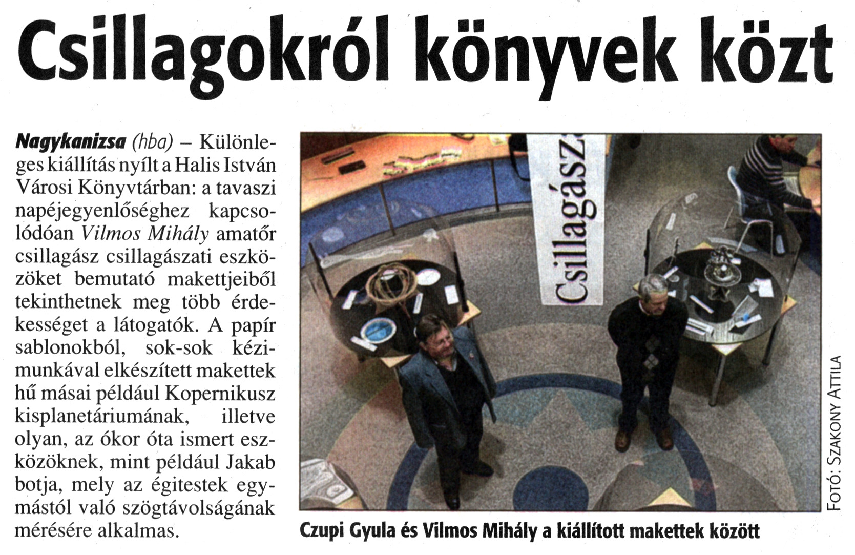 Nyilvános 1423 | 3883 | Zalai Hírlap 2013. március 18. 64. szám 12. oldal - Csillagokról könyvek közt | Csillagokról könyvek közt Nagykanizsa (hba) - Különleges kiállítás nyílt a Halis István Városi Könyvtárban: a tavaszi napéjegyenlőséghez kapcsolódóan Vilmos Mihály amatőr csillagász csillagászati eszközöket bemutató makettjeiből tekinthetnek meg több érdekességet a látogatók. A papír sablonokból, sok-sok kézimunkával elkészített makettek hű másai például Kopernikusz kisplanetáriumának, illetve olyan, az ókor óta ismert eszközöknek, mint például Jakab botja, mely az égitestek egymástól való szögtávolságának mérésére alkalmas. Czupi Gyula és Vilmos Mihály a kiállított makettek között Fotó: Szakony Attila |