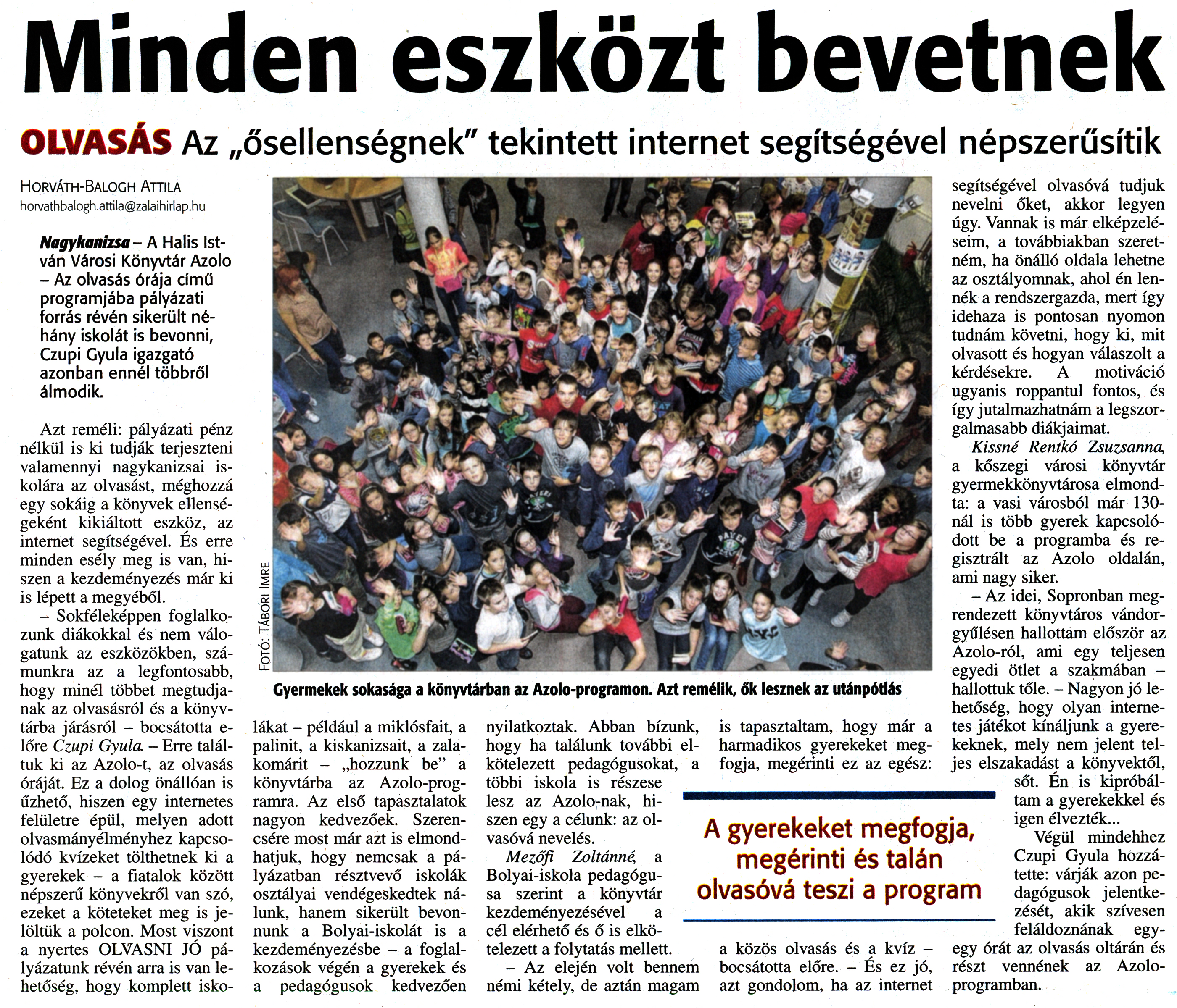 Nyilvános 1593 | 3327 | Zalai Hírlap 2014. november 19. 269. szám 7. oldal - Minden eszközt bevetnek | Minden eszközt bevetnek OLVASÁS Az „ősellenségnek" tekintett internet segítségével népszerűsítik A gyerekeket megfogja, megérinti és talán olvasóvá teszi a program Gyermekek sokasága a könyvtárban az Azolo-programon. Azt remélik, ők lesznek az utánpótlás Horváth-Balogh Attila horvathbalogh.attila@zalaihirlap.hu Nagykanizsa- A Halis István Városi Könyvtár Azolo - Az olvasás órája című programjába pályázati forrás révén sikerült néhány iskolát is bevonni, Czupi Gyula igazgató azonban ennél többről álmodik. Azt reméli: pályázati pénz nélkül is ki tudják terjeszteni valamennyi nagykanizsai iskolára az olvasást, méghozzá egy sokáig a könyvek ellenségeként kikiáltott eszköz, az internet segítségével. És erre minden esély meg is van, hiszen a kezdeményezés már ki is lépett a megyéből. - Sokféleképpen foglalkozunk diákokkal és nem válogatunk az eszközökben, számunkra az a legfontosabb, hogy minél többet megtudjanak az olvasásról és a könyvtárba járásról - bocsátotta e-lőre Czupi Gyula - Erre találtuk ki az Azolo-t, az olvasás óráját. Ez a dolog önállóan is űzhető, hiszen egy internetes felületre épül, melyen adott olvasmányélményhez kapcsolódó kvízeket tölthetnek ki a gyerekek - a fiatalok között népszerű könyvekről van szó, ezeket a köteteket meg is jelöltük a polcon. Most viszont a nyertes OLVASNI JÓ pályázatunk révén arra is van lehetőség, hogy komplett iskolákat - például a miklósfait, a palinit, a kiskanizsait, a zalakomárit - „hozzunk be" a könyvtárba az Azolo-programra. Az első tapasztalatok nagyon kedvezőek. Szerencsére most már azt is elmondhatjuk, hogy nemcsak a pályázatban résztvevő iskolák osztályai vendégeskedtek nálunk, hanem sikerült bevonnunk a Bolyai-iskolát is a kezdeményezésbe - a foglalkozások végén a gyerekek és a pedagógusok kedvezően nyilatkoztak. Abban bízunk, hogy ha találunk további elkötelezett pedagógusokat, a többi iskola is részese lesz az Azolo-nak, hiszen egy a célunk: az olvasóvá nevelés. Mezőfi Zoltánné, a Bolyai-iskola pedagógusa szerint a könyvtár kezdeményezésével a cél elérhető és ő is elkötelezett a folytatás mellett. - Az elején volt bennem némi kétely, de aztán magam is tapasztaltam, hogy már a harmadikos gyerekeket megfogja, megérinti ez az egész: a közös olvasás és a kvíz -bocsátotta előre. - És ez jó, azt gondolom, ha az internet segítségével olvasóvá tudjuk nevelni őket, akkor legyen úgy. Vannak is már elképzeléseim, a továbbiakban szeretném, ha önálló oldala lehetne az osztályomnak, ahol én lennék a rendszergazda, mert így idehaza is pontosan nyomon tudnám követni, hogy ki, mit olvasott és hogyan válaszolt a kérdésekre. A motiváció ugyanis roppantul fontos, és így jutalmazhatnám a legszorgalmasabb diákjaimat. Kissné Rentkó Zsuzsanna a kőszegi városi könyvtár gyermekkönyvtárosa elmondta: a vasi városból már 130-nál is több gyerek kapcsolódott be a programba és regisztrált az Azolo oldalán, ami nagy siker. - Az idei, Sopronban megrendezett könyvtáros vándorgyűlésen hallottam először az Azolo-ról, ami egy teljesen egyedi ötlet a szakmában -hallottuk tőle. - Nagyon jó lehetőség, hogy olyan internetes játékot kínáljunk a gyerekeknek, mely nem jelent teljes elszakadást a könyvektől, sőt. Én is kipróbáltam a gyerekekkel és igen élvezték... Végül mindehhez Czupi Gyula hozzátette: várják azon pedagógusok jelentkezését, akik szívesen feláldoznának egy-egy órát az olvasás oltárán és részt vennének az Azolo-programban. |