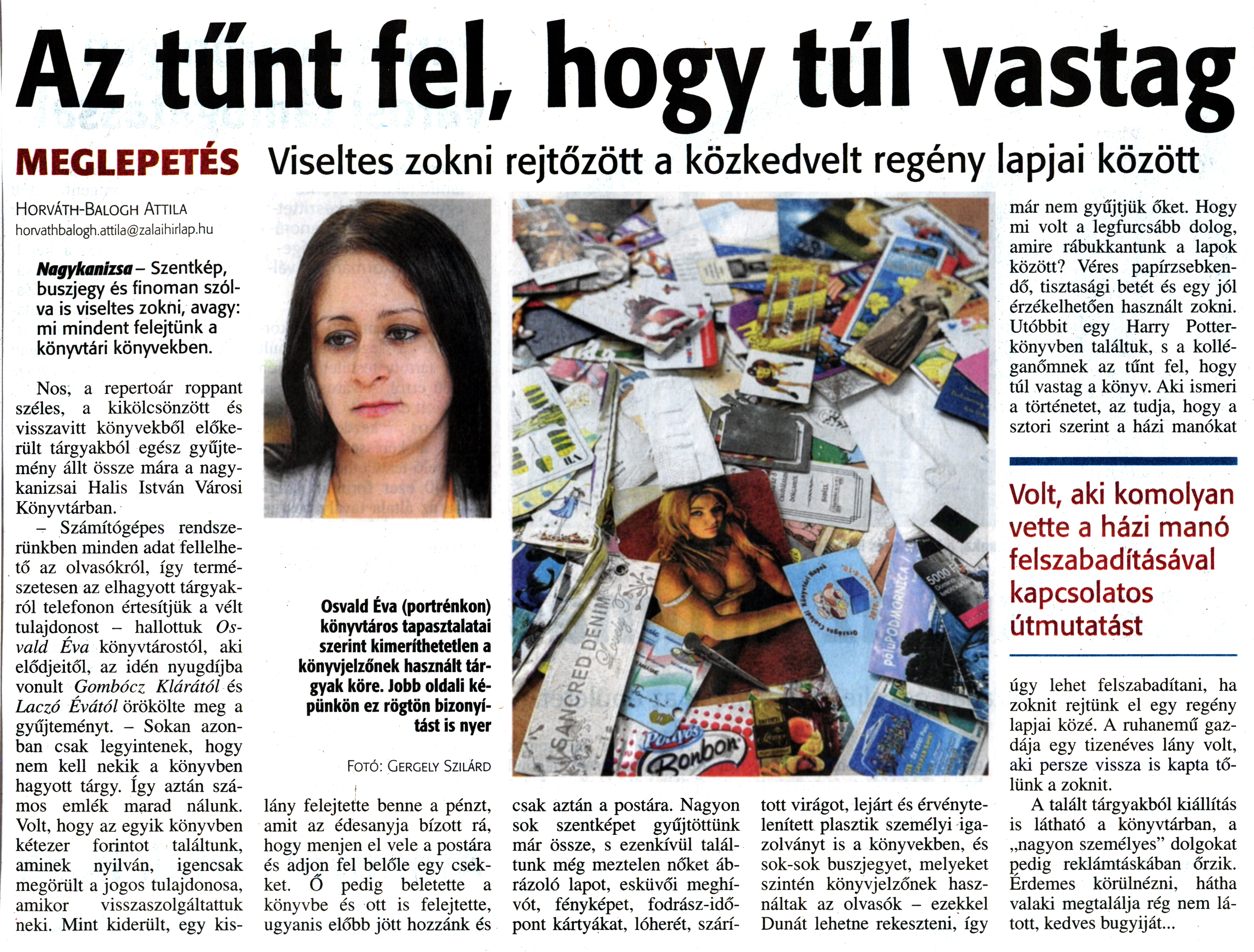 Nyilvános 1374 | 3131 | Zalai Hírlap 2015. május 6. 105. szám 3. oldal | Az tűnt fel, hogy túl vastag MEGLEPETÉS Viseltes zokni rejtőzött a közkedvelt regény lapjai között Horváth-Balogh Attila horvathbalogh.attila@zalaihirlap.hu Nagykanizsa- Szentkép, buszjegy és finoman szólva is viseltes zokni, avagy: mi mindent felejtünk a könyvtári könyvekben. Nos, a repertoár roppant széles, a kikölcsönzött és visszavitt könyvekből előkerült tárgyakból egész gyűjtemény állt össze mára a nagykanizsai Halis István Városi Könyvtárban. - Számítógépes rendszerünkben minden adat fellelhető az olvasókról, így természetesen az elhagyott tárgyakról telefonon értesítjük a vélt tulajdonost - hallottuk Os-vald Éva könyvtárostól, aki elődjeitől, az idén nyugdíjba vonult Gombócz Klárától és Laczó Évától örökölte meg a gyűjteményt. - Sokan azonban csak legyintenek, hogy nem kell nekik a könyvben hagyott tárgy. így aztán számos emlék marad nálunk. Volt, hogy az egyik könyvben kétezer forintot találtunk, aminek nyilván, igencsak megörült a jogos tulajdonosa, amikor visszaszolgáltattuk neki. Mint kiderült, egy kis- lány felejtette benne a pénzt, amit az édesanyja bízott rá, hogy menjen el vele a postára és adjon fel belőle egy csekket. O pedig beletette a könyvbe és ott is felejtette, ugyanis előbb jött hozzánk és csak aztán a postára. Nagyon sok szentképet gyűjtöttünk már össze, s ezenkívül találtunk még meztelen nőket ábrázoló lapot, esküvői meghívót, fényképet, fodrász-idő-pont kártyákat, lóherét, szárí- tott virágot, lejárt és érvénytelenített plasztik személyi igazolványt is a könyvekben, és sok-sok buszjegyet, melyeket szintén könyvjelzőnek használtak az olvasók - ezekkel Dunát lehetne rekeszteni, így már nem gyűjtjük őket. Hogy mi volt a legfurcsább dolog, amire rábukkantunk a lapok között? Véres papírzsebkendő, tisztasági betét és egy jól érzékelhetően használt zokni. Utóbbit egy Harry Potter-könyvben találtuk, s a kolléganőmnek az tűnt fel, hogy túl vastag a könyv. Aki ismeri a történetet, az tudja, hogy a sztori szerint a házi manókat Volt, aki komolyan vette a házi manó felszabadításával kapcsolatos útmutatást úgy lehet felszabadítani, ha zoknit rejtünk el egy regény lapjai közé. A ruhanemű gazdája egy tizenéves lány volt, aki persze vissza is kapta tőlünk a zoknit. A talált tárgyakból kiállítás is látható a könyvtárban, a „nagyon személyes" dolgokat pedig reklámtáskában őrzik. Érdemes körülnézni, hátha valaki megtalálja rég nem látott, kedves bugyiját... |
