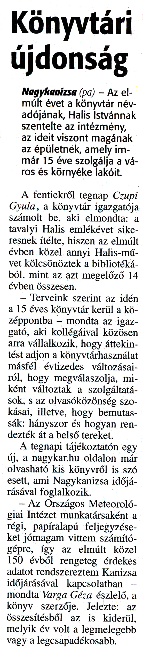 Nyilvános 1508 | 3300 | Zalai Hírlap 2016. január 6. 4. szám 3. oldal - Könyvtári újdonság | Könyvtári újdonság Nagykanizsa (pa) - Az elmúlt évet a könyvtár névadójának, Halis Istvánnak szentelte az intézmény, az ideit viszont magának az épületnek, amely immár 15 éve szolgálja a város és környéke lakóit. A fentiekről tegnap Czupi Gyula, a könyvtár igazgatója számolt be, aki elmondta: a tavalyi Halis emlékévet sikeresnek ítélte, hiszen az elmúlt évben közel annyi Halis-művet kölcsönöztek a bibliotékából, mint az azt megelőző 14 évben összesen. - Terveink szerint az idén a 15 éves könyvtár kerül a középpontba - mondta az igazgató, aki kollégáival közösen arra vállalkozik, hogy áttekintést adjon a könyvtárhasználat másfél évtizedes változásairól, hogy megválaszolja, miként változtak a szolgáltatások, s az olvasóközönség szokásai, illetve, hogy bemutassák: hányszor és hogyan rendezték át a belső tereket. A tegnapi tájékoztatón egy új, a nagykar.hu oldalon már olvasható kis könyvről is szó esett, ami Nagykanizsa időjárásával foglalkozik. - Az Országos Meteorológiai Intézet munkatársaként a régi, papíralapú feljegyzéseket jómagam vittem számítógépre, így az elmúlt közel 150 évből rengeteg érdekes adatot rendszereztem Kanizsa időjárásával kapcsolatban - mondta Varga Géza észlelő, a könyv szerzője. Jelezte: az összesítésből az is kiderül, melyik év volt a legmelegebb vagy a legcsapadékosabb. |