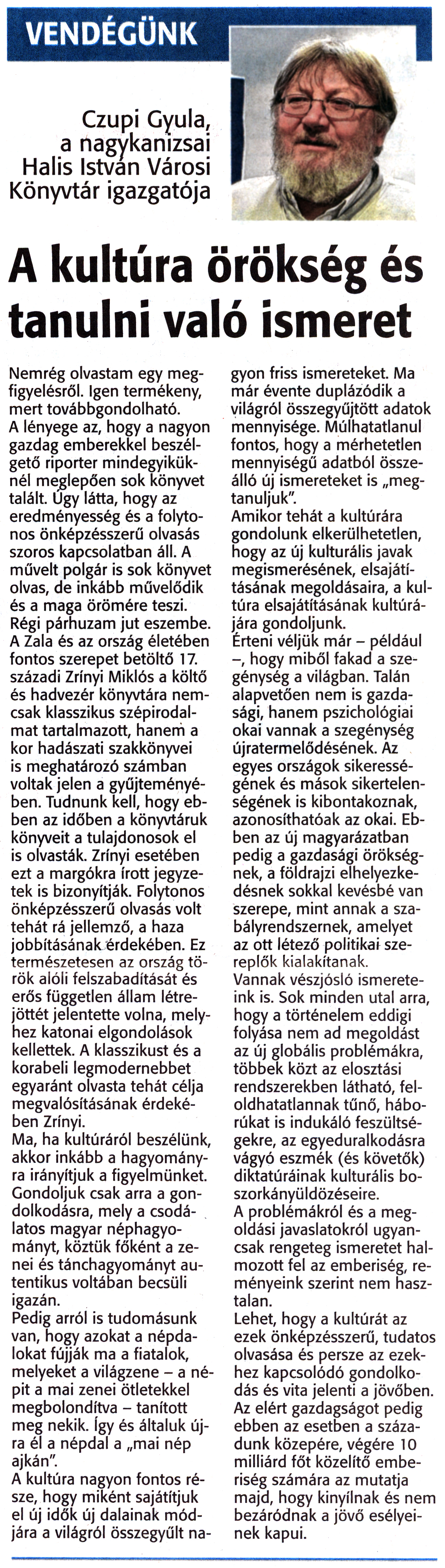 Nyilvános 1652 | 3153 | Zalai Hírlap 2016. január 16. 13. szám 2. oldal | VENDÉGÜNK Czupi Gyula, a nagykanizsai Halis István Városi Könyvtár igazgatója A kultúra örökség és tanulni való ismeret Nemrég olvastam egy megfigyelésről. Igen termékeny, mert továbbgondolható. A lényege az, hogy a nagyon gazdag emberekkel beszélgető riporter mindegyiküknél meglepően sok könyvet talált. Úgy látta, hogy az eredményesség és a folytonos önképzésszerű olvasás szoros kapcsolatban áll. A művelt polgár is sok könyvet olvas, de inkább művelődik és a maga örömére teszi. Régi párhuzam jut eszembe. A Zala és az ország életében fontos szerepet betöltő 17. századi Zrínyi Miklós a költő és hadvezér könyvtára nemcsak klasszikus szépirodalmat tartalmazott, hanem a kor hadászati szakkönyvei is meghatározó számban voltak jelen a gyűjteményében. Tudnunk kell, hogy ebben az időben a könyvtáruk könyveit a tulajdonosok el is olvasták. Zrínyi esetében ezt a margókra írott jegyzetek is bizonyítják. Folytonos önképzésszerű olvasás volt tehát rá jellemző, a haza jobbításának érdekében. Ez természetesen az ország török alóli felszabadítását és erős független állam létrejöttét jelentette volna, melyhez katonai elgondolások kellettek. A klasszikust és a korabeli legmodernebbet egyaránt olvasta tehát célja megvalósításának érdekében Zrínyi. Ma, ha kultúráról beszélünk, akkor inkább a hagyományra irányítjuk a figyelmünket. Gondoljuk csak arra a gondolkodásra, mely a csodálatos magyar néphagyományt, köztük főként a zenei és tánchagyományt autentikus voltában becsüli igazán. Pedig arról is tudomásunk van, hogy azokat a népdalokat fújják ma a fiatalok, melyeket a világzene - a népit a mai zenei ötletekkel megbolondítva - tanított meg nekik. Így és általuk újra él a népdal a „mai nép ajkán". A kultúra nagyon fontos része, hogy miként sajátítjuk el új idők új dalainak módjára a világról összegyűlt nagyon friss ismereteket. Ma már évente duplázódik a világról összegyűjtött adatok mennyisége. Múlhatatlanul fontos, hogy a mérhetetlen mennyiségű adatból összeálló új ismereteket is „megtanuljuk". Amikor tehát a kultúrára gondolunk elkerülhetetlen, hogy az új kulturális javak megismerésének, elsajátításának megoldásaira, a kultúra elsajátításának kultúrájára gondoljunk. Érteni véljük már - például hogy miből fakad a szegénység a világban. Talán alapvetően nem is gazdasági, hanem pszichológiai okai vannak a szegénység újratermelődésének. Az egyes országok sikerességének és mások sikertelenségének is kibontakoznak, azonosíthatóak az okai. Ebben az új magyarázatban pedig a gazdasági örökségnek, a földrajzi elhelyezkedésnek sokkal kevésbé van szerepe, mint annak a szabályrendszernek, amelyet az ott létező politikai szereplők kialakítanak. Vannak vészjósló ismereteink is. Sok minden utal arra, hogy a történelem eddigi folyása nem ad megoldást az új globális problémákra, többek közt az elosztási rendszerekben látható, feloldhatatlannak tűnő, háborúkat is indukáló feszültségekre, az egyeduralkodásra vágyó eszmék (és követők) diktatúráinak kulturális boszorkányüldözéseire. A problémákról és a megoldási javaslatokról ugyancsak rengeteg ismeretet halmozott fel az emberiség, reményeink szerint nem hasztalan. Lehet, hogy a kultúrát az ezek önképzésszerű, tudatos olvasása és persze az ezekhez kapcsolódó gondolkodás és vita jelenti a jövőben. Az elért gazdagságot pedig ebben az esetben a századunk közepére, végére 10 milliárd főt közelítő emberiség számára az mutatja majd, hogy kinyílnak és nem bezáródnak a jövő esélyeinek kapui. |