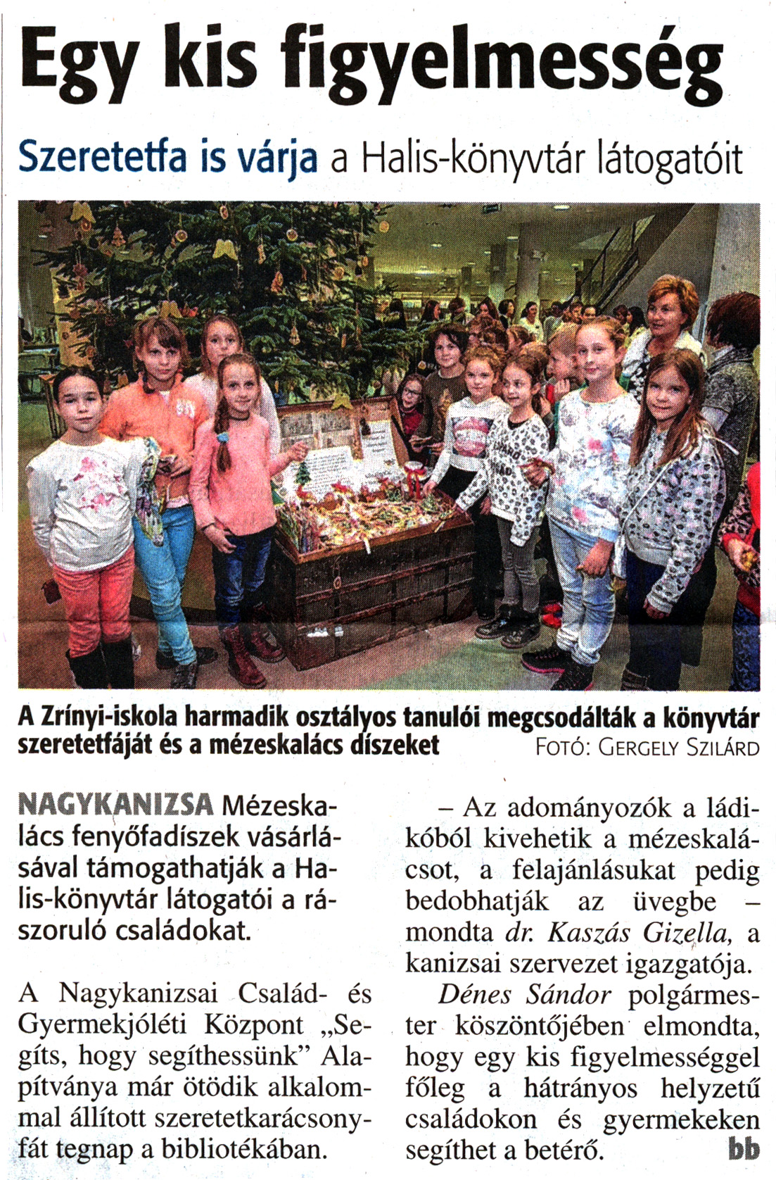 Nyilvános 1416 | 2732 | Zalai Hírlap 2017. december 5. 283. szám 16. oldal | Egy kis figyelmesség Szeretetfa is várja a Halis-könyvtár látogatóit A Zrínyi-iskola harmadik osztályos tanulói megcsodálták a könyvtár szeretetfáját és a mézeskalács díszeket Fotó: Gergely Szilárd NAGYKANIZSA Mézeskalács fenyőfadíszek vásárlásával támogathatják a Halis-könyvtár látogatói a rászoruló családokat. A Nagykanizsai Család- és Gyermekjóléti Központ „Segíts, hogy segíthessünk" Alapítványa már ötödik alkalommal állított szeretetkarácsonyfát tegnap a bibliotékában. - Az adományozók a ládikóból kivehetik a mézeskalácsot, a felajánlásukat pedig bedobhatják az üvegbe -mondta dr. Kaszás Gizella, a kanizsai szervezet igazgatója. Dénes Sándor polgármester köszöntőjében elmondta, hogy egy kis figyelmességgel főleg a hátrányos helyzetű családokon és gyermekeken segíthet a betérő. bb |