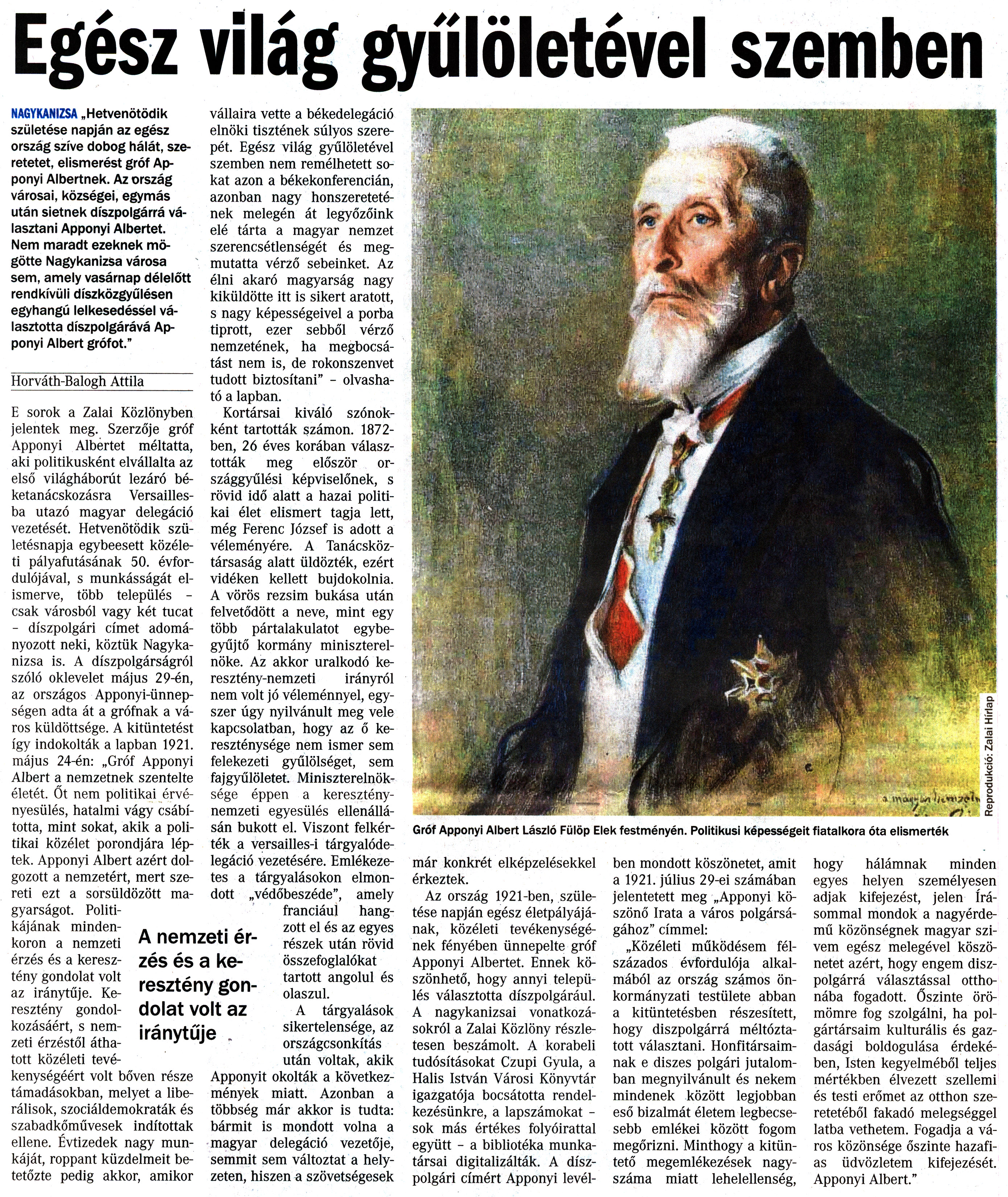 Nyilvános 1439 | 2853 | Vasárnapi Zalai Hírlap 2018. június 23. 25. szám 5. oldal | Egész világ gyűlöletével szemben Gróf Apponyi Albert László Fülöp Elek festményén. Politikusi képességeit fiatalkora óta elismerték NAGYKANIZSA „Hetvenötödik születése napján az egész ország szíve dobog hálát, szeretetet, elismerést gróf Apponyi Albertnek. Az ország városai, községei, egymás után sietnek díszpolgárrá választani Apponyi Albertet. Nem maradt ezeknek mögötte Nagykanizsa városa sem, amely vasárnap délelőtt rendkívüli díszközgyűlésen egyhangú lelkesedéssel választotta díszpolgárává Apponyi Albert grófot." Horváth-Balogh Attila_ E sorok a Zalai Közlönyben jelentek meg. Szerzője gróf Apponyi Albertet méltatta, aki politikusként elvállalta az első világháborút lezáró béketanácskozásra Versailles-ba utazó magyar delegáció vezetését. Hetvenötödik születésnapja egybeesett közéleti pályafutásának 50. évfordulójával, s munkásságát elismerve, több település -csak városból vagy két tucat - díszpolgári címet adományozott neki, köztük Nagykanizsa is. A díszpolgárságról szóló oklevelet május 29-én, az országos Apponyi-ünnep-ségen adta át a grófnak a város küldöttsége. A kitüntetést így indokolták a lapban 1921. május 24-én: „Gróf Apponyi Albert a nemzetnek szentelte életét. Őt nem politikai érvényesülés, hatalmi vágy csábította, mint sokat, akik a politikai közélet porondjára léptek. Apponyi Albert azért dolgozott a nemzetért, mert szereti ezt a sorsüldözött magyarságot. Politikájának mindenkoron a nemzeti érzés és a keresztény gondolat volt az iránytűje. Keresztény gondolkozásáért, s nemzeti érzéstől áthatott közéleti tevékenységéért volt bőven része támadásokban, melyet a liberálisok, szociáldemokraták és szabadkőművesek indítottak ellene. Évtizedek nagy munkáját, roppant küzdelmeit betetőzte pedig akkor, amikor vállaira vette a békedelegáció elnöki tisztének súlyos szerepét. Egész világ gyűlöletével szemben nem remélhetett sokat azon a békekonferencián, azonban nagy honszeretetének melegén át legyőzőink elé tárta a magyar nemzet szerencsétlenségét és megmutatta vérző sebeinket. Az élni akaró magyarság nagy kiküldötte itt is sikert aratott, s nagy képességeivel a porba tiprott, ezer sebből vérző nemzetének, ha megbocsátást nem is, de rokonszenvet tudott biztosítani" - olvasható a lapban. Kortársai kiváló szónokként tartották számon. 1872-ben, 26 éves korában választották meg először országgyűlési képviselőnek, s rövid idő alatt a hazai politikai élet elismert tagja lett, még Ferenc József is adott a véleményére. A Tanácsköztársaság alatt üldözték, ezért vidéken kellett bujdokolnia. A vörös rezsim bukása után felvetődött a neve, mint egy több pártalakulatot egybe-gyűjtő kormány miniszterelnöke. Az akkor uralkodó keresztény-nemzeti irányról nem volt jó véleménnyel, egyszer úgy nyilvánult meg vele kapcsolatban, hogy az ő kereszténysége nem ismer sem felekezeti gyűlölséget, sem fajgyűlöletet. Miniszterelnöksége éppen a kereszténynemzeti egyesülés ellenállásán bukott el. Viszont felkérték a versailles-i tárgyalódelegáció vezetésére. Emlékezetes a tárgyalásokon elmondott „védőbeszéde", amely franciául hangzott el és az egyes részek után rövid összefoglalókat tartott angolul és olaszul. A tárgyalások sikertelensége, az országcsonkítás után voltak, akik Apponyit okolták a következmények miatt. Azonban a többség már akkor is tudta: bármit is mondott volna a magyar delegáció vezetője, semmit sem változtat a helyzeten, hiszen a szövetségesek már konkrét elképzelésekkel érkeztek. Az ország 1921-ben, születése napján egész életpályájának, közéleti tevékenységének fényében ünnepelte gróf Apponyi Albertet. Ennek köszönhető, hogy annyi település választotta díszpolgárául. A nagykanizsai vonatkozásokról a Zalai Közlöny részletesen beszámolt. A korabeli tudósításokat Czupi Gyula, a Halis István Városi Könyvtár igazgatója bocsátotta rendelkezésünkre, a lapszámokat -sok más értékes folyóirattal együtt - a bibliotéka munkatársai digitalizálták. A díszpolgári címért Apponyi levél- ben mondott köszönetet, amit a 1921. július 29-ei számában jelentetett meg „Apponyi köszönő Irata a város polgárságához" címmel: „Közéleti működésem félszázados évfordulója alkalmából az ország számos önkormányzati testülete abban a kitüntetésben részesített, hogy díszpolgárrá méltóztatott választani. Honfitársaimnak e diszes polgári jutalomban megnyilvánult és nekem mindenek között legjobban eső bizalmát életem legbecsesebb emlékei között fogom megőrizni. Minthogy a kitüntető megemlékezések nagyszáma miatt lehelellenség, hogy hálámnak minden egyes helyen személyesen adjak kifejezést, jelen írásommal mondok a nagyérdemű közönségnek magyar szivem egész melegével köszönetet azért, hogy engem díszpolgárrá választással otthonába fogadott. Őszinte örömömre fog szolgálni, ha polgártársaim kulturális és gazdasági boldogulása érdekében, Isten kegyelméből teljes mértékben élvezett szellemi és testi erőmet az otthon szeretetéből fakadó melegséggel latba vethetem. Fogadja a város közönsége őszinte hazafias üdvözletem kifejezését. Apponyi Albert." A nemzeti érzés és a keresztény gondolat volt az iránytűje . |