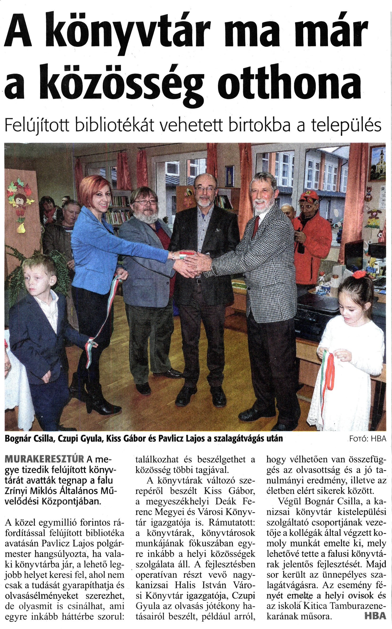 Nyilvános 1371 | 2343 | Zalai Hírlap 2018. december 22. 297. szám 16. oldal | A könyvtár ma már a közösség otthona Felújított bibliotékát vehetett birtokba a település Bognár Csilla, Czupi Gyula, Kiss Gábor és Pavlicz Lajos a szalagátvágás után Fotó: hba MURAKERESZTÚR A megye tizedik felújított könyvtárát avatták tegnap a falu Zrínyi Miklós Általános Művelődési Központjában. A közel egymillió forintos ráfordítással felújított bibliotéka avatásán Pavlicz Lajos polgármester hangsúlyozta, ha valaki könyvtárba jár, a lehető legjobb helyet keresi fel, ahol nem csak a tudását gyarapíthatja és olvasásélményeket szerezhet, de olyasmit is csinálhat, ami egyre inkább háttérbe szorul: találkozhat és beszélgethet a közösség többi tagjával. A könyvtárak változó szerepéről beszélt Kiss Gábor, a megyeszékhelyi Deák Ferenc Megyei és Városi Könyvtár igazgatója is. Rámutatott: a könyvtárak, könyvtárosok munkájának fókuszában egyre inkább a helyi közösségek szolgálata áll. A fejlesztésben operatívan részt vevő nagykanizsai Halis István Városi Könyvtár igazgatója, Czupi Gyula az olvasás jótékony hatásairól beszélt, például arról, hogy vélhetően van összefüggés az olvasottság és a jó tanulmányi eredmény, illetve az életben elért sikerek között. Végül Bognár Csilla, a kanizsai könyvtár kistelepülési szolgáltató csoportjának vezetője a kollégák által végzett komoly munkát emelte ki, mely lehetővé tette a falusi könyvtárak jelentős fejlesztését. Majd sor került az ünnepélyes szalagátvágásra. Az esemény fényét emelte a helyi ovisok és az iskola Kitica Tamburazene-karának műsora. HBA |